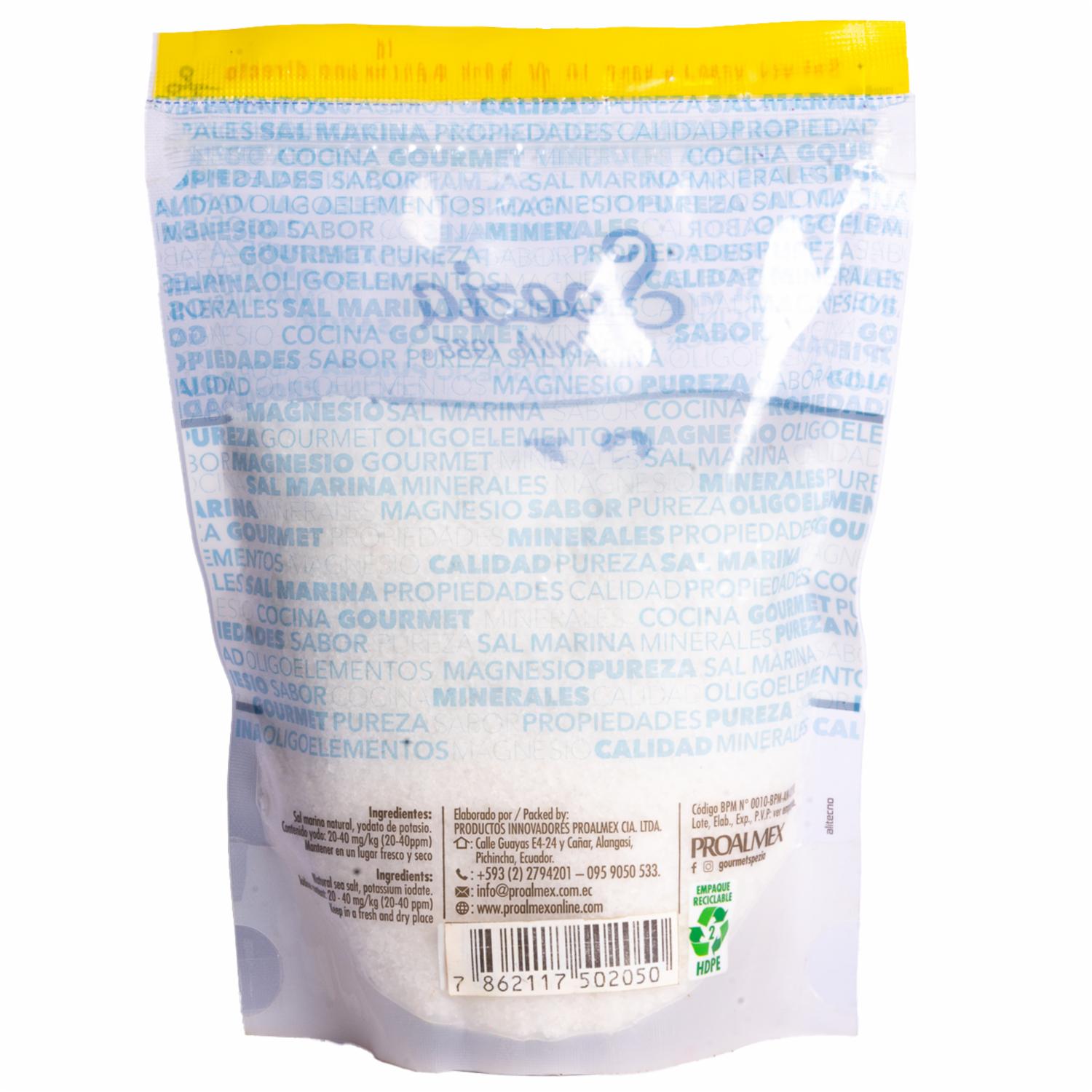 - Una granulometría semi-fina, ideal para aportar textura a tus recetas caseras y como su nombre lo indica, contiene yodo, un mineral esencial para la salud. No contiene anticompactante