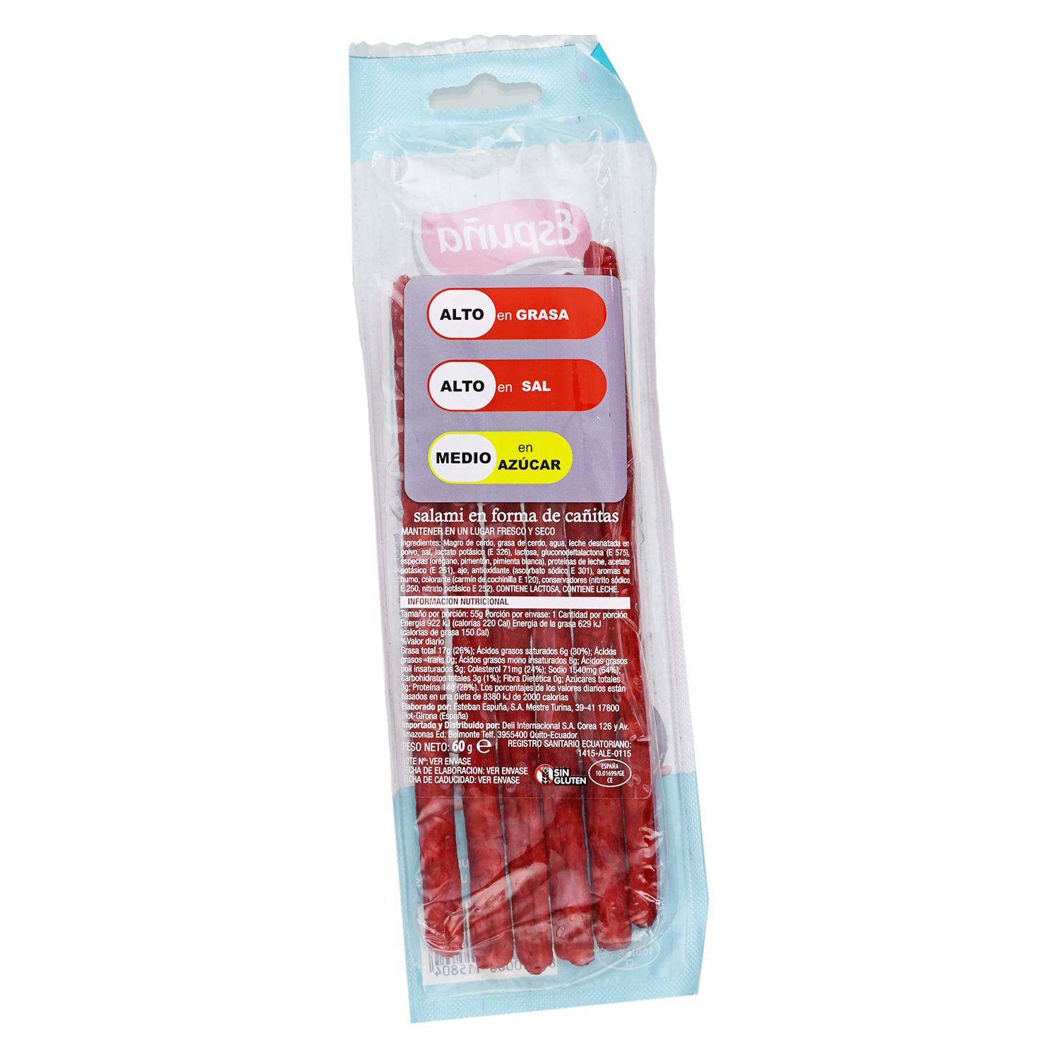 - El Salami Cañitas ESPUÑA en presentación de 60 g es una deliciosa opción para disfrutar de un embutido tradicional y sabroso en cualquier momento