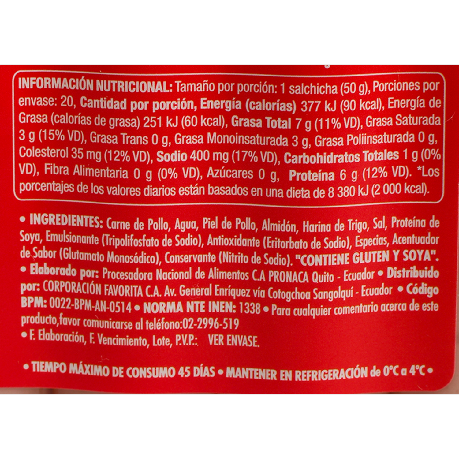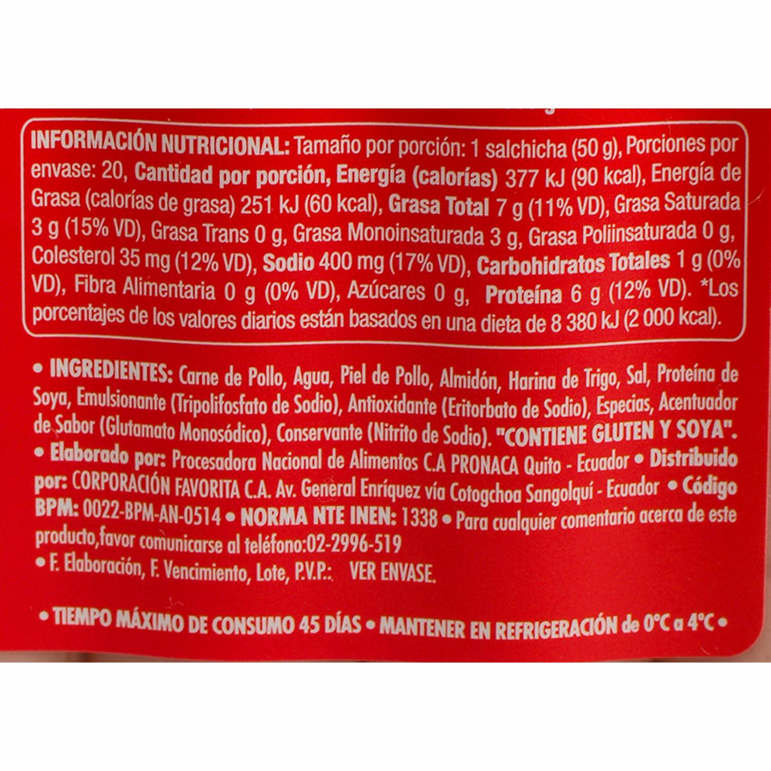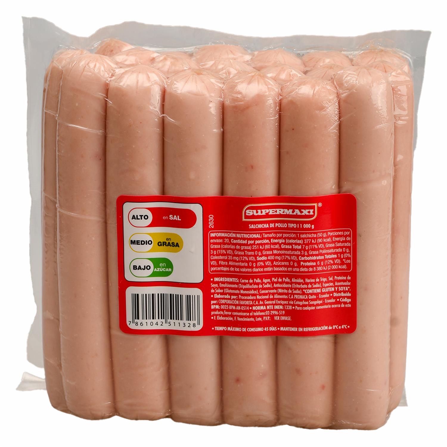 Salchicha De Pollo SUPERMAXI 1000g – SUPERMAXI. Disponible en nuestros locales. Precio y stock pueden variar según la tienda.