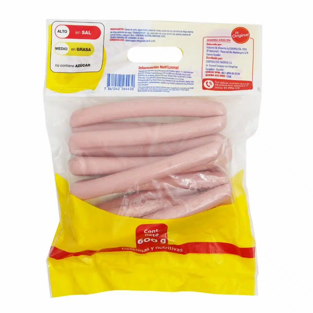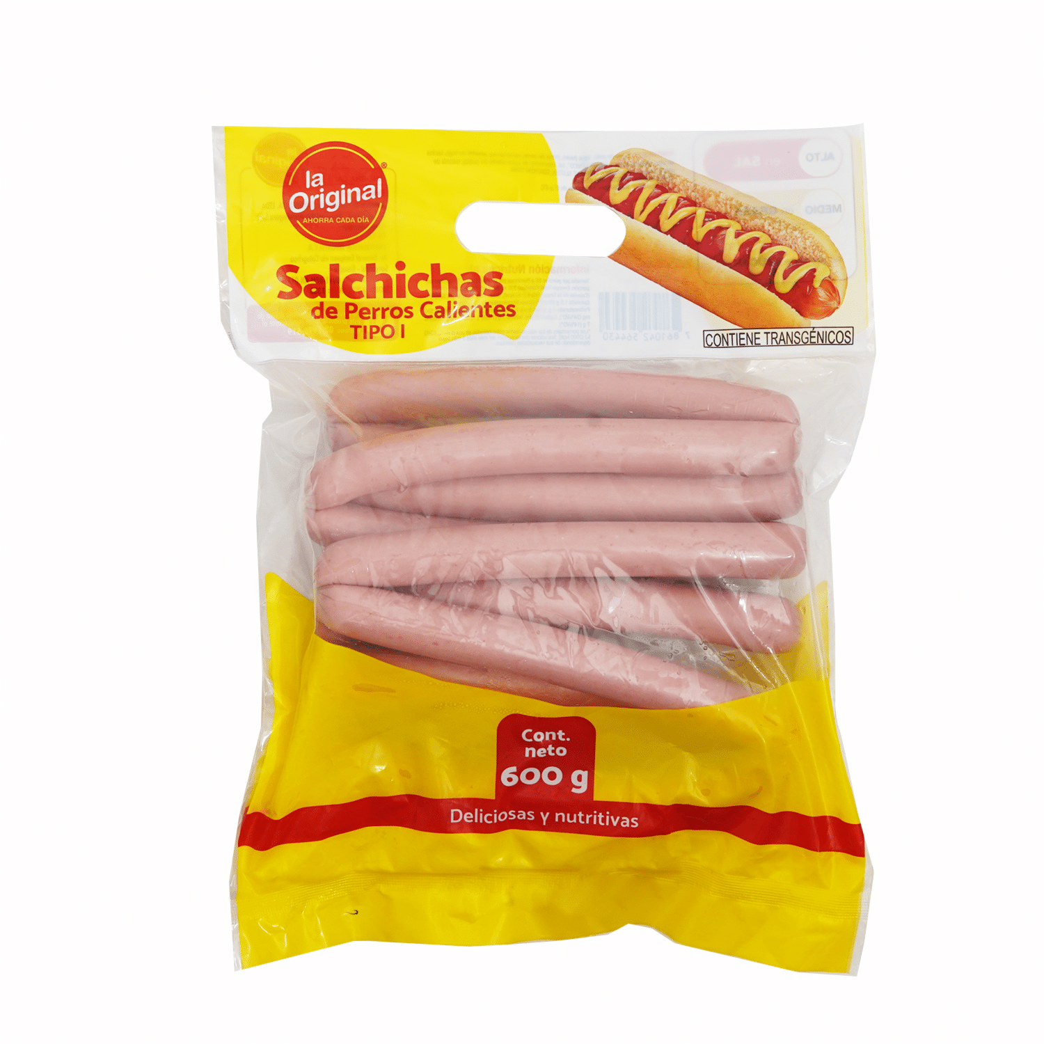 Salchicha Perros Calientes LA ORIGINAL 600 G – LA ORIGINAL. Disponible en nuestros locales. Precio y stock pueden variar según la tienda.