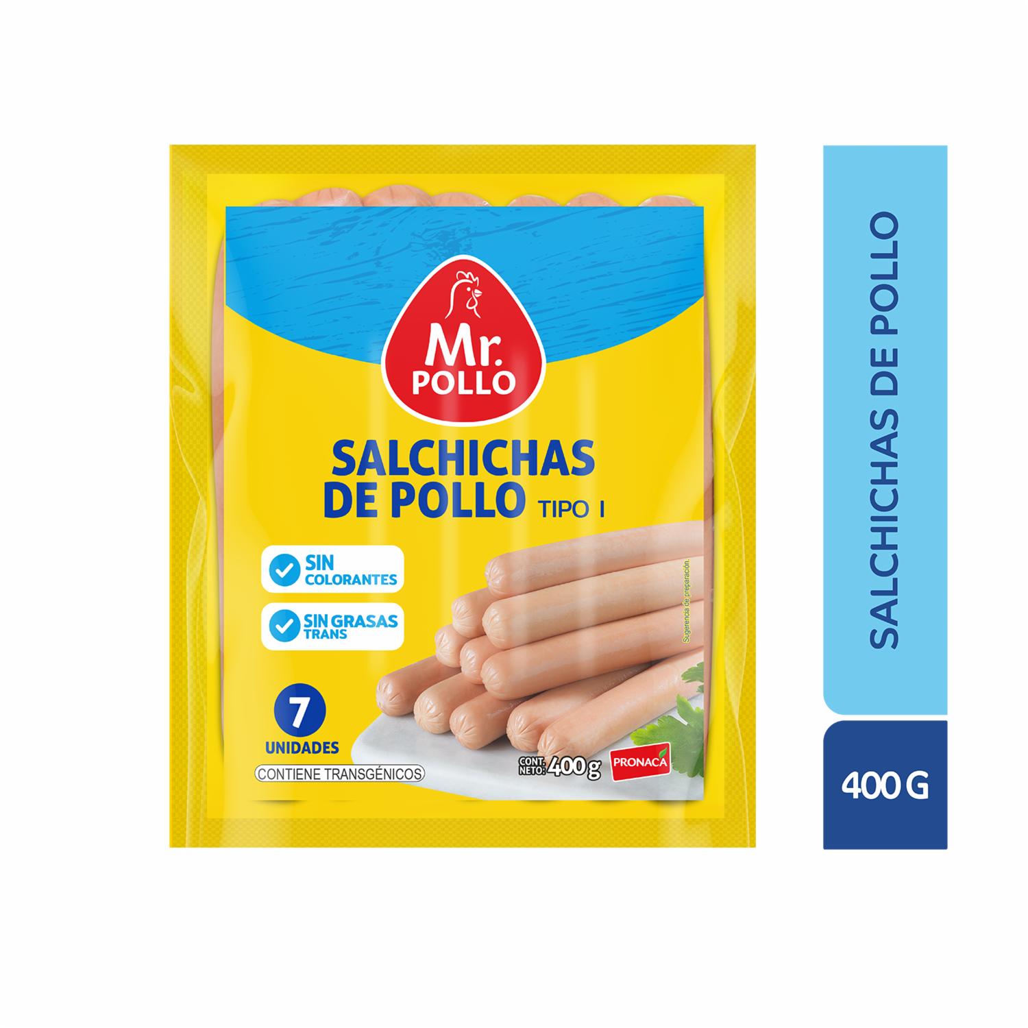 Salchicha De Pollo MR. POLLO 400 G – MR. POLLO. Disponible en nuestros locales. Precio y stock pueden variar según la tienda.