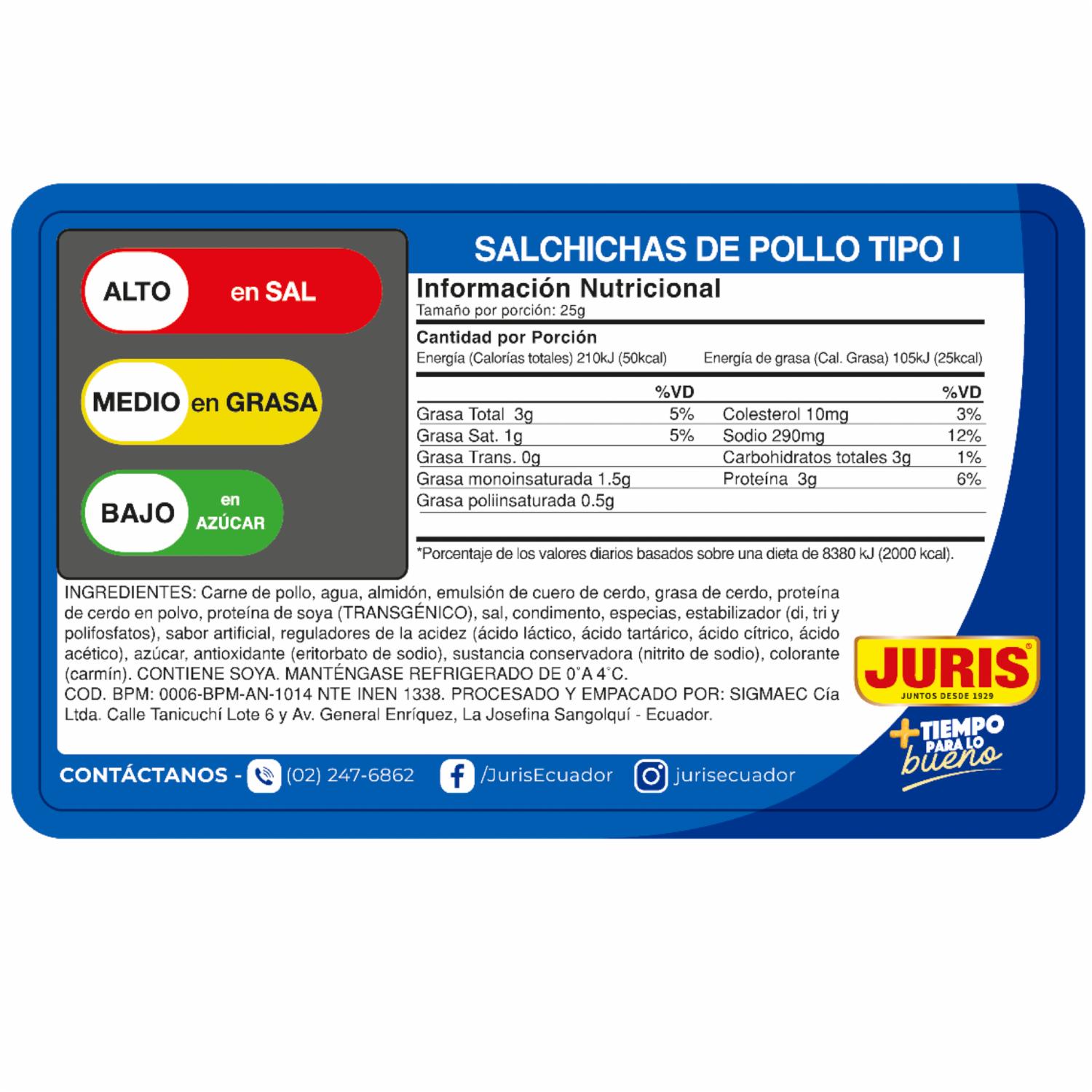 consultando preciosSalchichas De Pollo JURIS Termoempacado – JURIS. Disponible en nuestros locales. Precio y stock pueden variar según la tienda.