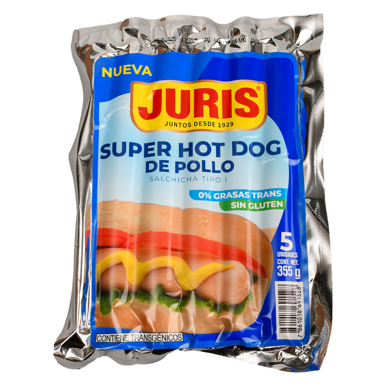 Salchichas De Pollo Super Hot Dog JURIS 355 G – JURIS. Disponible en nuestros locales. Precio y stock pueden variar según la tienda.