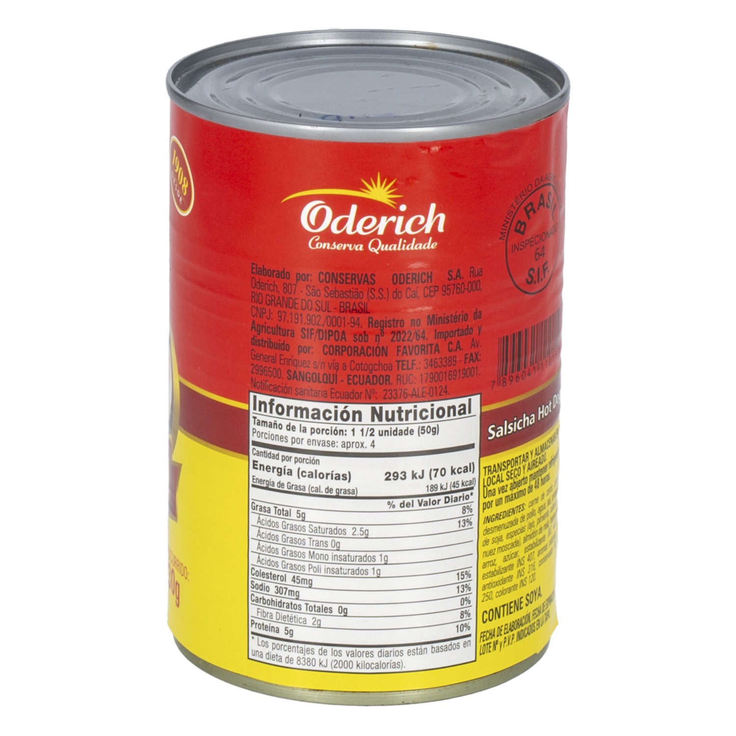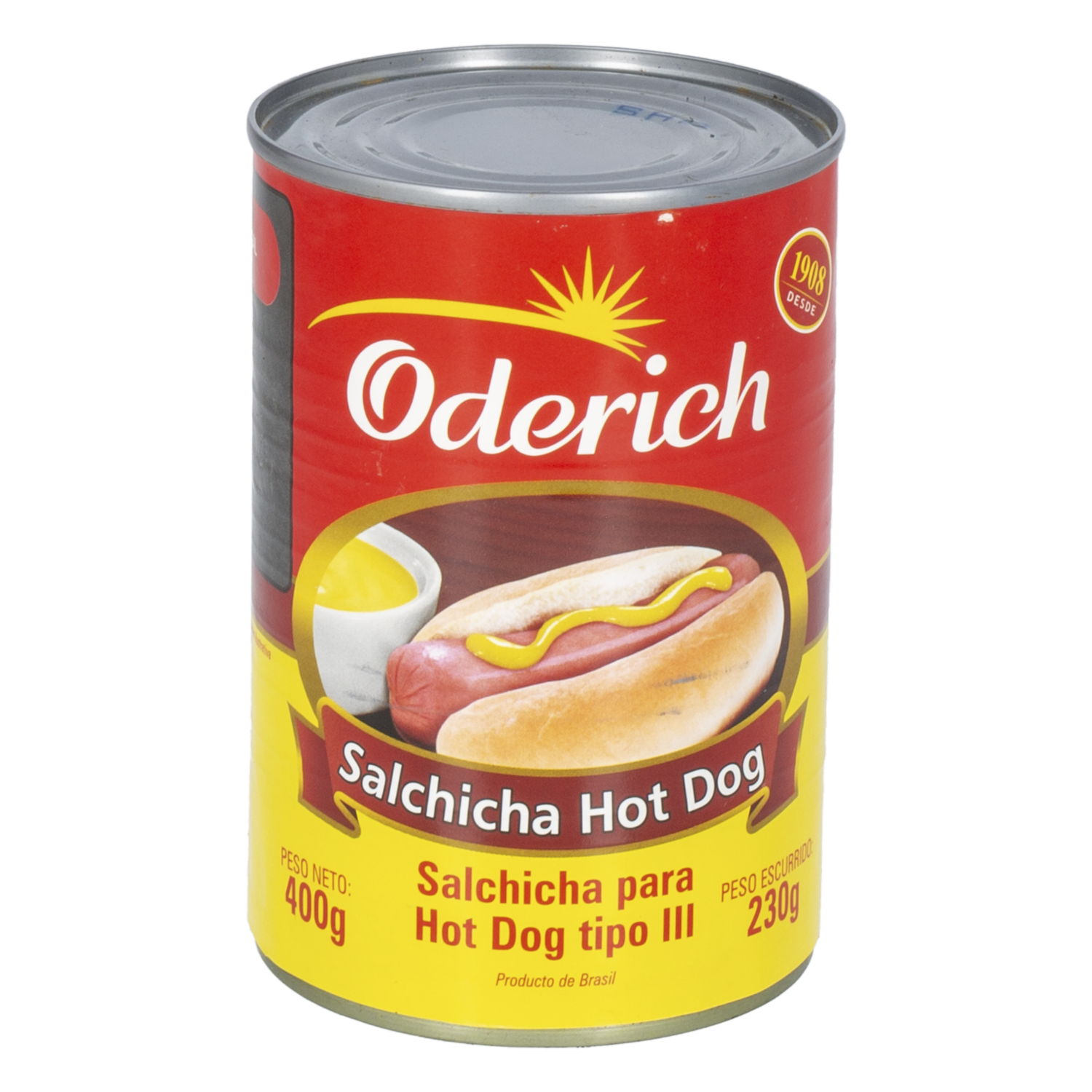 - Salchichas tipo 3 para hot dog ODERICH en lata de 400 g, listas para calentar y servir. Perfectas para hot dogs, meriendas y comidas rápidas, en presentación práctica y fácil de almacenar