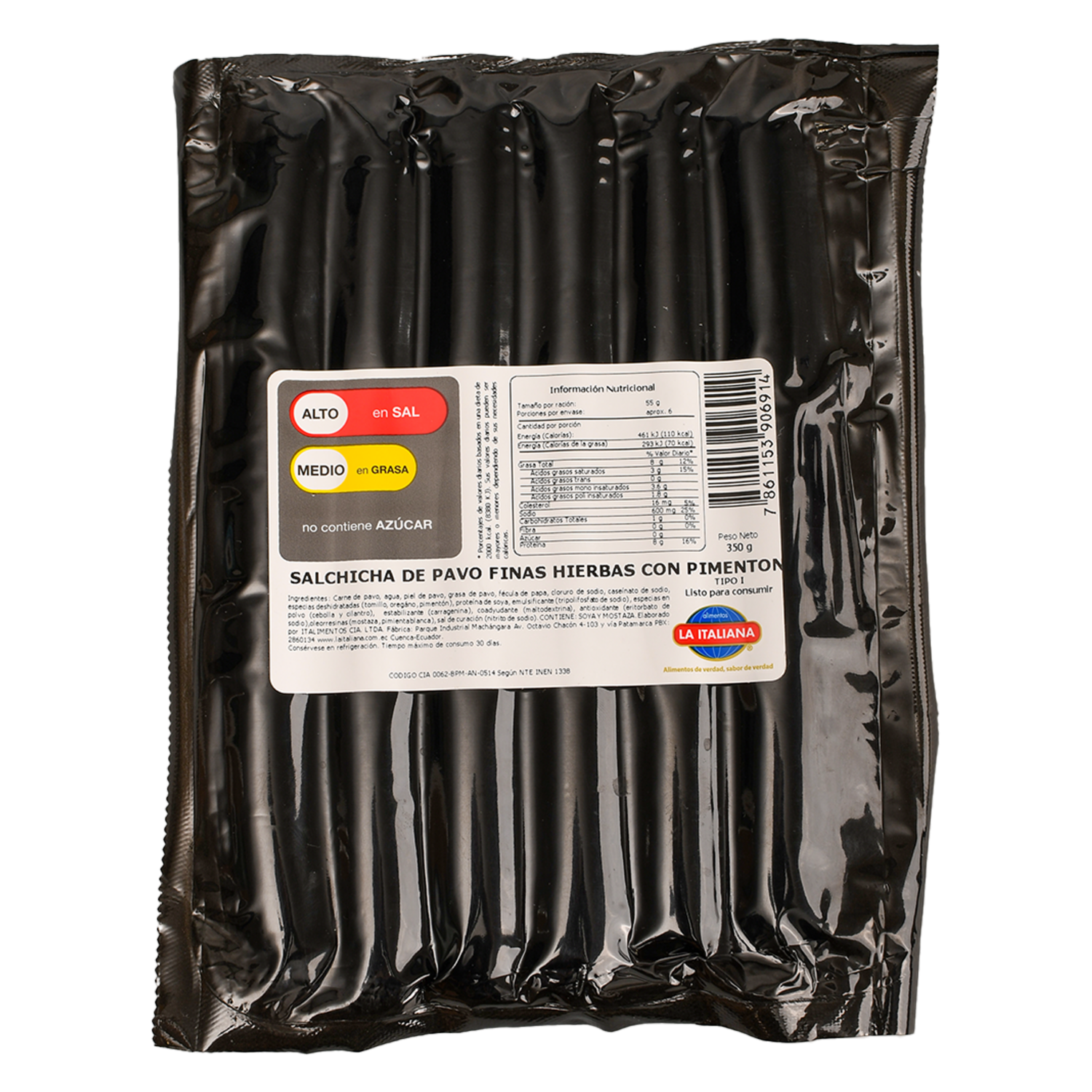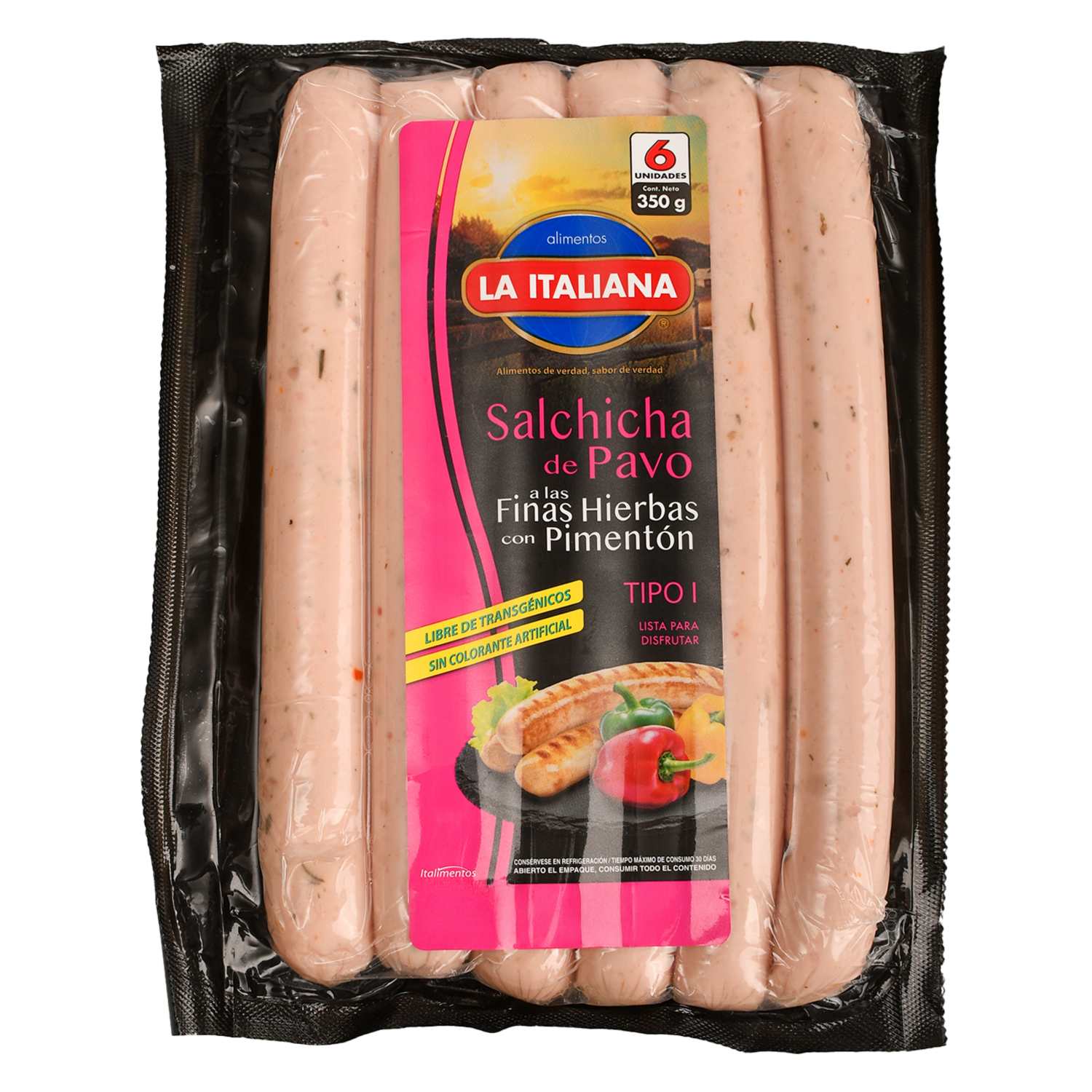 Salchichas Pavo Finas Hierbas LA ITALIANA 350 G – LA ITALIANA. Disponible en nuestros locales. Precio y stock pueden variar según la tienda.