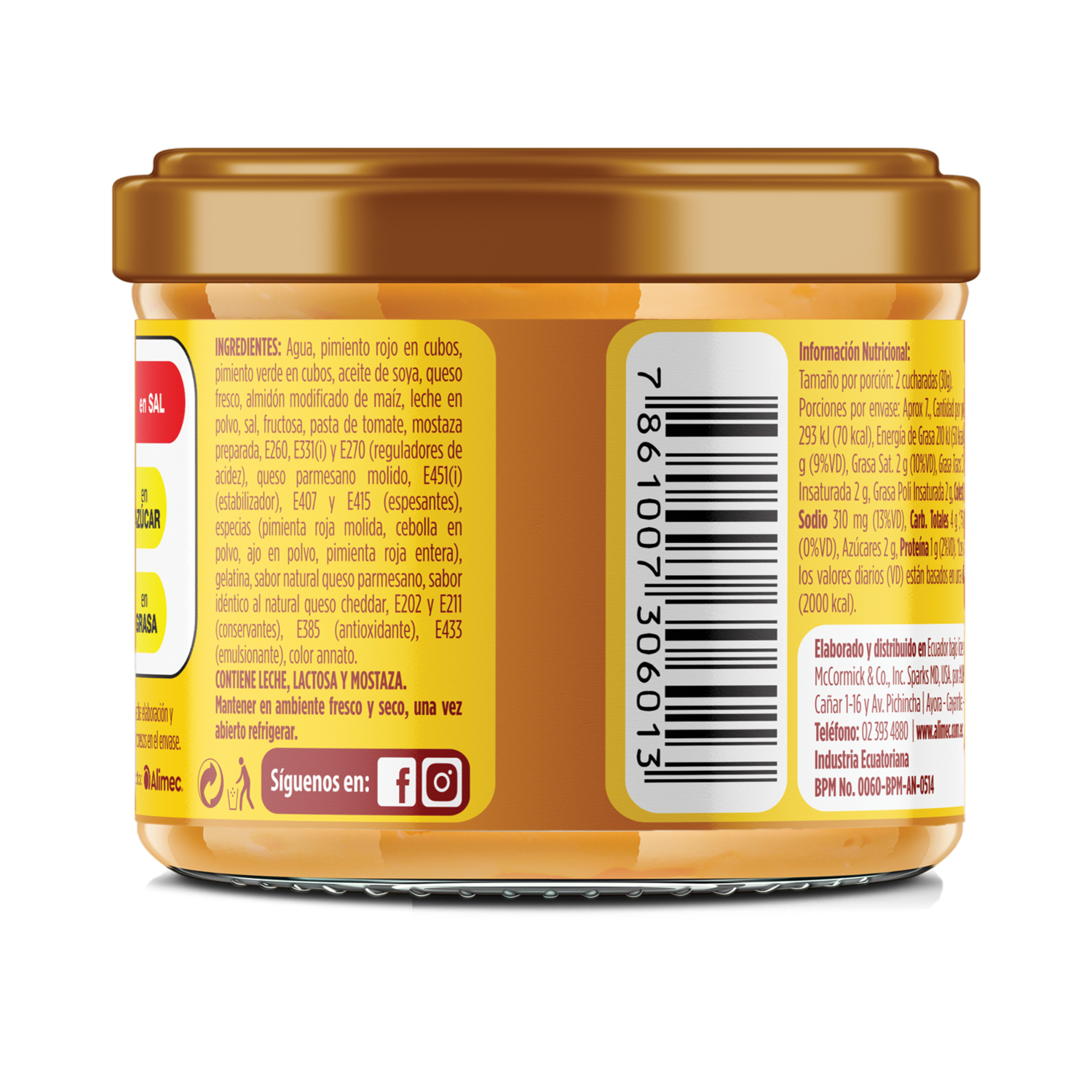 - Salsa para dipear hecha con Queso Real (semi - maduro) y trocitos de pimientos rojos y verdes que le aportan un sabor inigualable. Lista para consumir. acompañante ideal de nachos, papas y todo tipo de snacks, incluso vegetales frescos