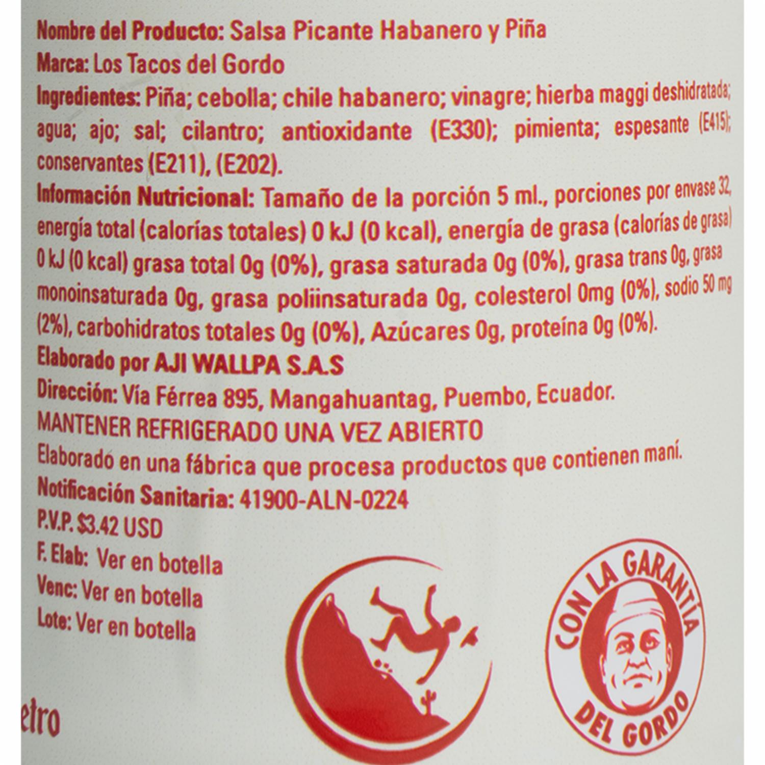 - La Salsa Picante de Habanero con Piña de LOS TACOS DEL GORDO eleva tus comidas con su mezcla explosiva de picante intenso y el dulzor jugoso de la piña. Ideal para tacos, carnes, mariscos o donde quieras dar un giro atrevido