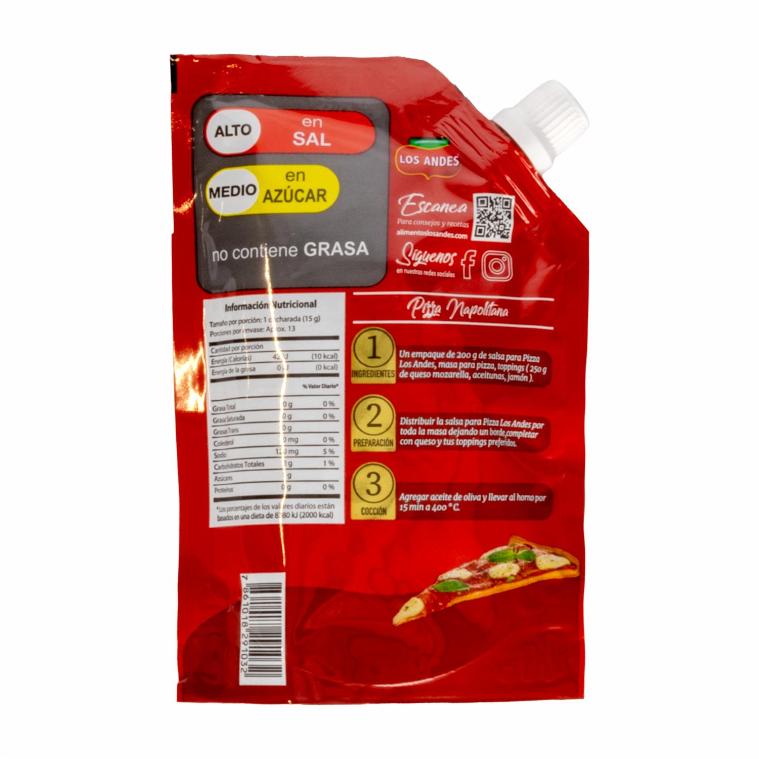 - La Salsa Pizza Doy Pack LOS ANDES es una salsa especialmente diseñada para darle un sabor delicioso y auténtico a tus pizzas caseras. Con una mezcla perfecta de tomates frescos, hierbas y especias, esta salsa te permitirá disfrutar de una pizza con sabor tradicional, en pocos minutos