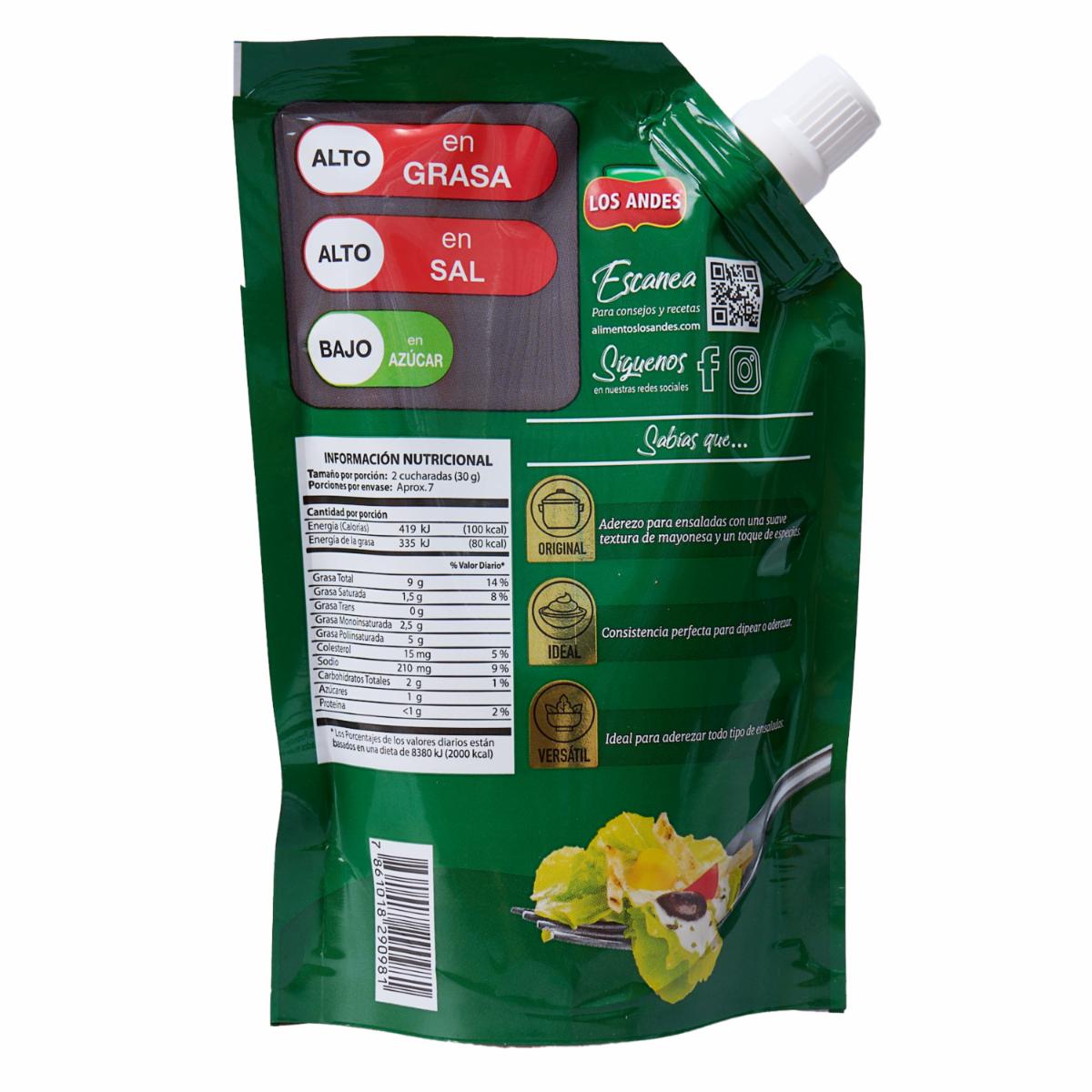 - Salsa Ranch Doy Pack LOS ANDES es cremosa y deliciosa, perfecta para acompañar tus platillos favoritos con un toque fresco y sabroso. Ideal para ensaladas, dips o sándwiches. Su práctico envase doy pack facilita su uso y conservación