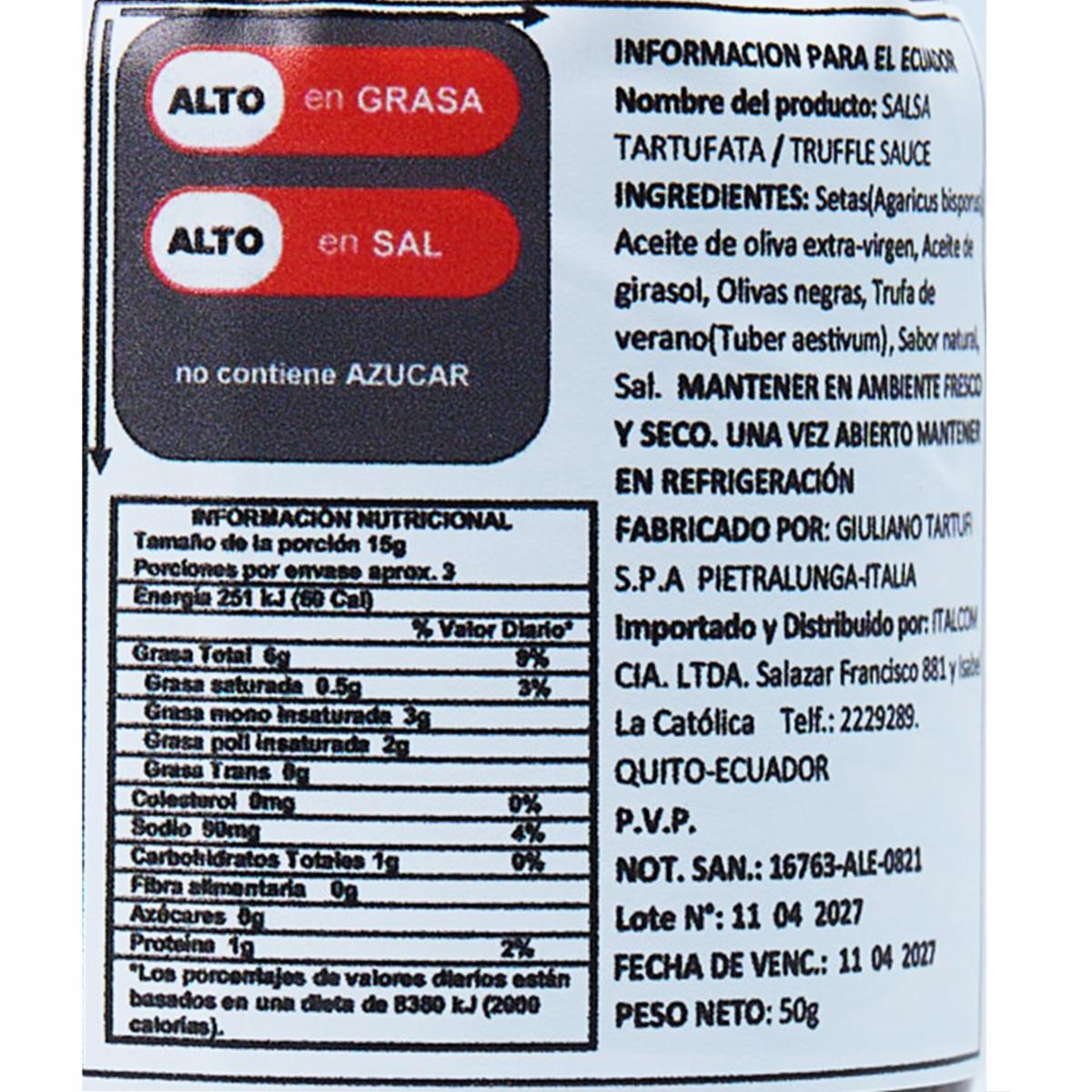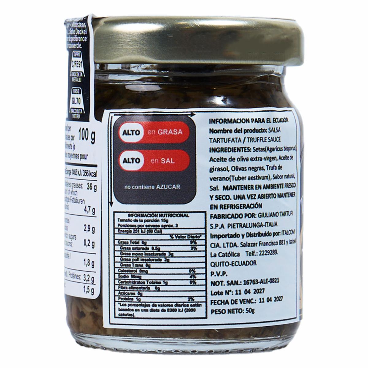 - La salsa trufada giuliano Tartufi es Una salsa a Base De Hongos Champiñones, Aceitunas Negras Y Trufa De Verano