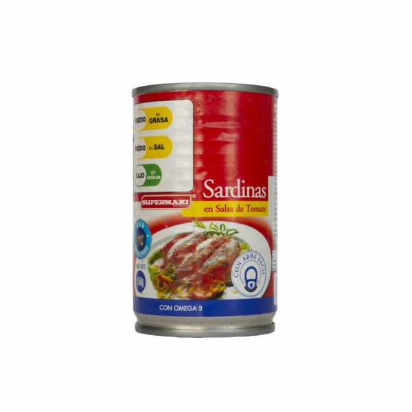 Sardinas en Salsa de Tomate Supermaxi esta elaborado con sardina, Salsa de Tomate (Agua, Pasta de Tomate, Azúcar, Sal, Carboximetilcelulosa). Contenido Neto 156 g. Peso Drenado 102 g CONTIENE PESCADO, RICO EN FOSFORO, se debe conservar en lugar fresco y seco. Una vez abierto cambiar envase y refrigerar