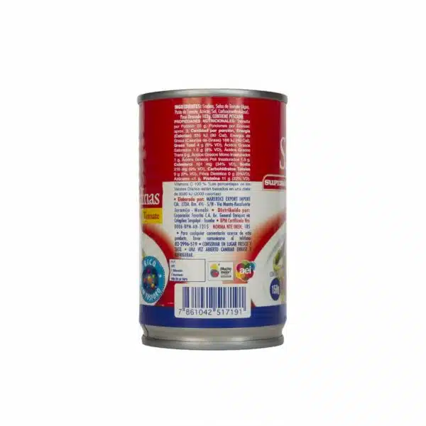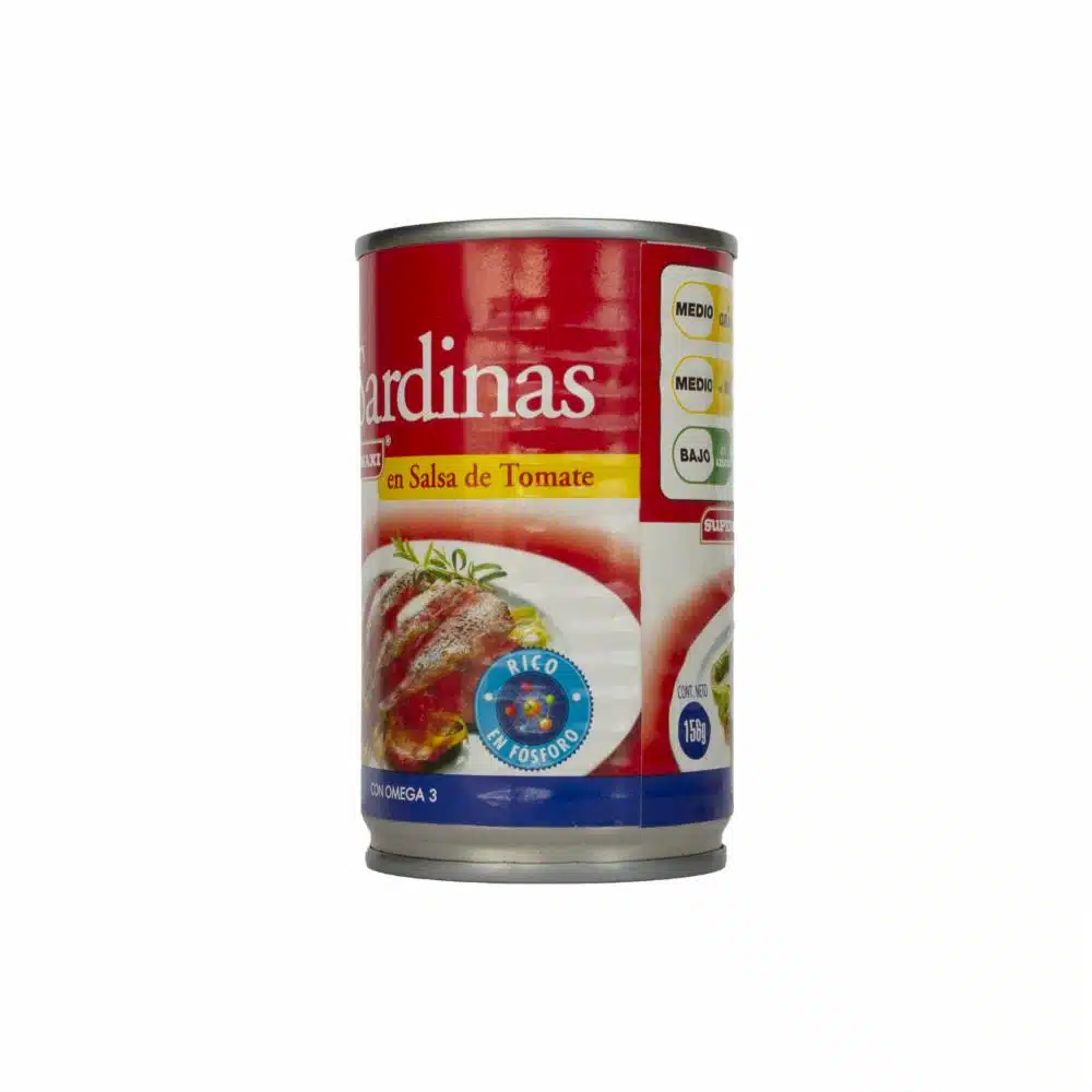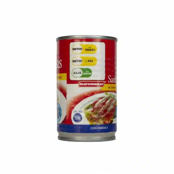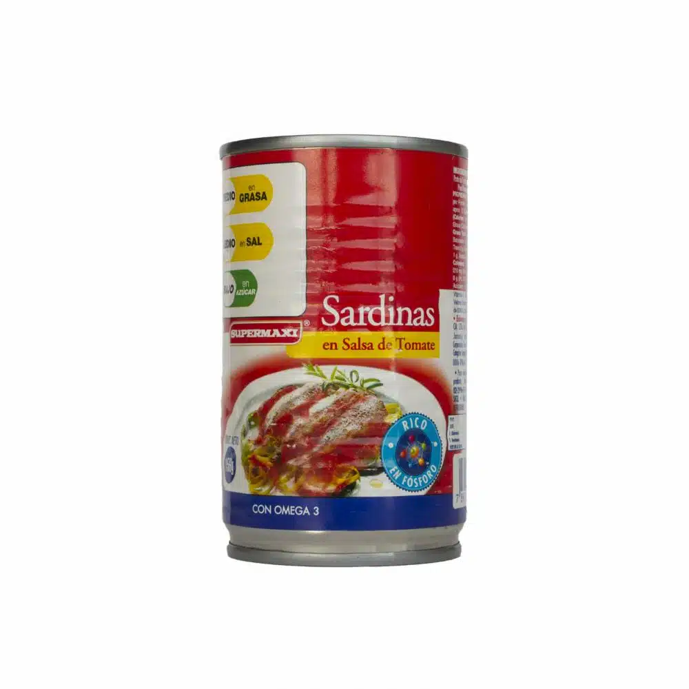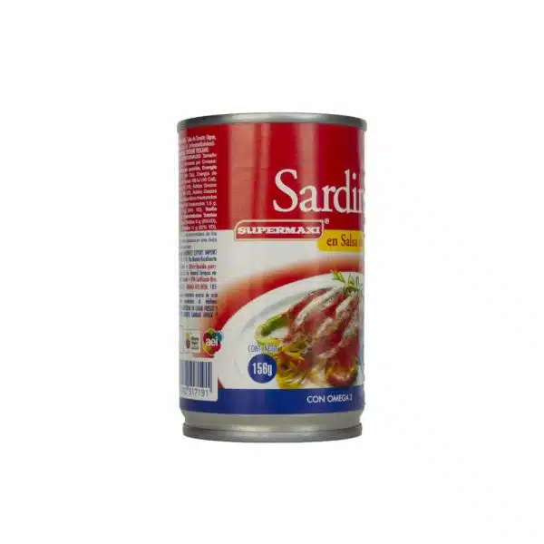 Sardinas en Salsa de Tomate Supermaxi esta elaborado con sardina, Salsa de Tomate (Agua, Pasta de Tomate, Azúcar, Sal, Carboximetilcelulosa). Contenido Neto 156 g. Peso Drenado 102 g CONTIENE PESCADO, RICO EN FOSFORO, se debe conservar en lugar fresco y seco. Una vez abierto cambiar envase y refrigerar