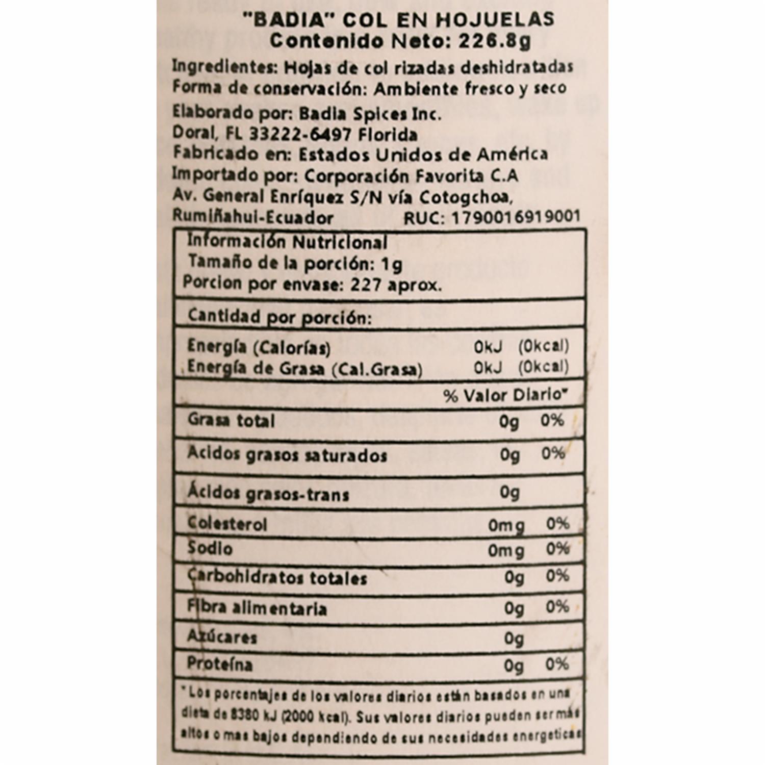 • - El sazonador Col en Hojuelas de Badia es un condimento que aporta sabor y aroma a tus platillos