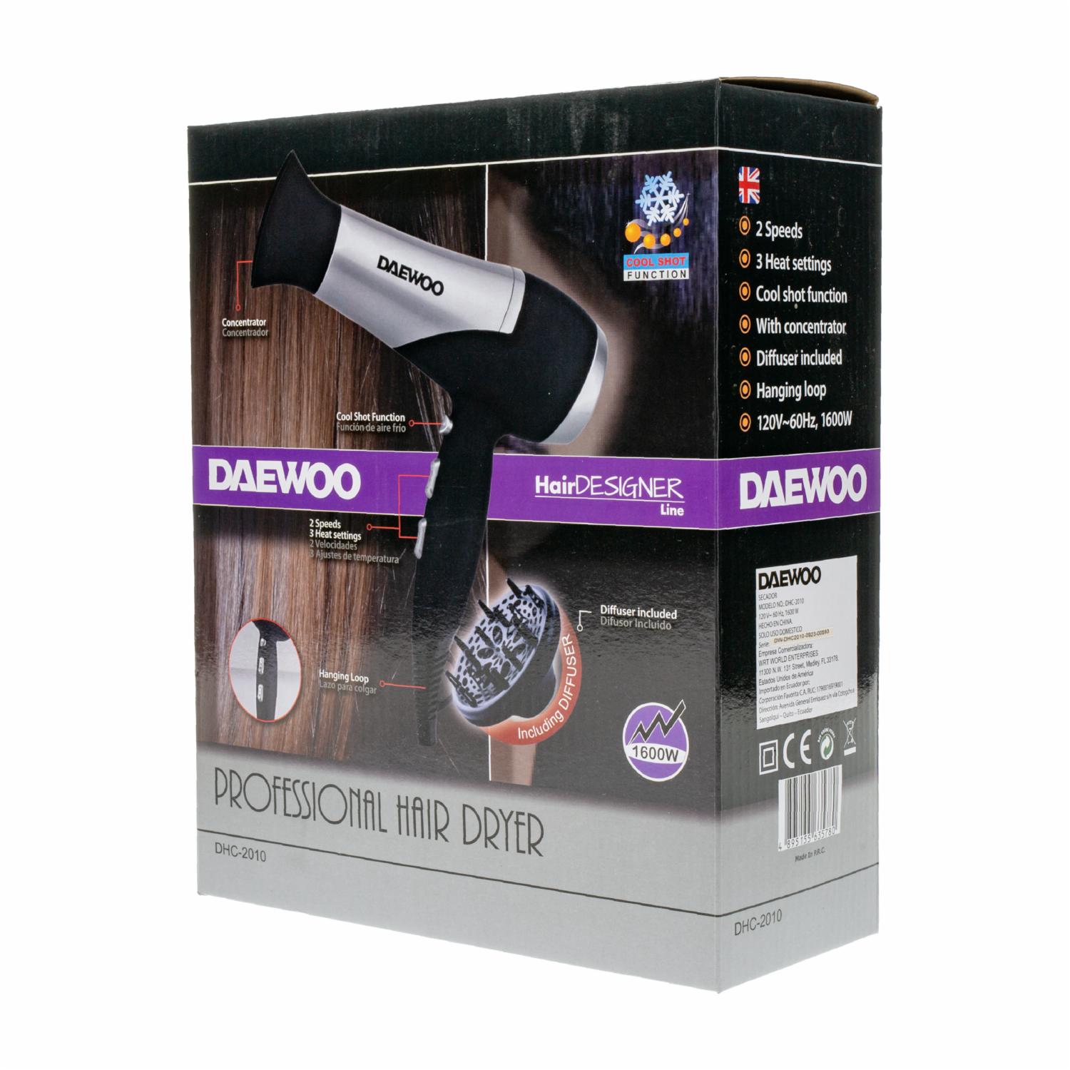 - Obtén un secado rápido y eficiente con el Secador de Cabello DAEWOO. Ideal para usar en casa o en salones de belleza, este secador es perfecto para dar forma a tu cabello y lograr peinados perfectos en poco tiempo