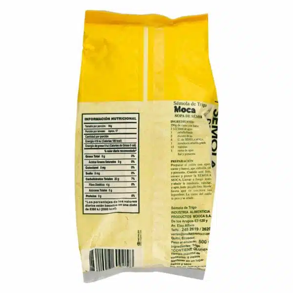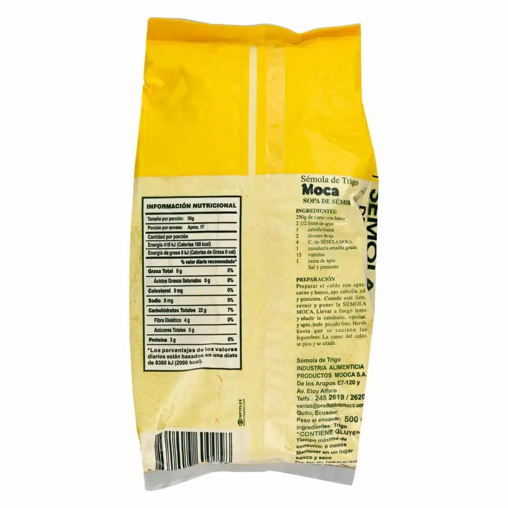 La Sémola de Trigo Moca es producida a partir de granos de excelente calidad, totalmente libres de Transgénicos .Los valores nutricionales de la Sémola de Trigo Moca son muchos y puede ser utilizada para hacer batidos y coladas, además de sus diversos usos en la cocina