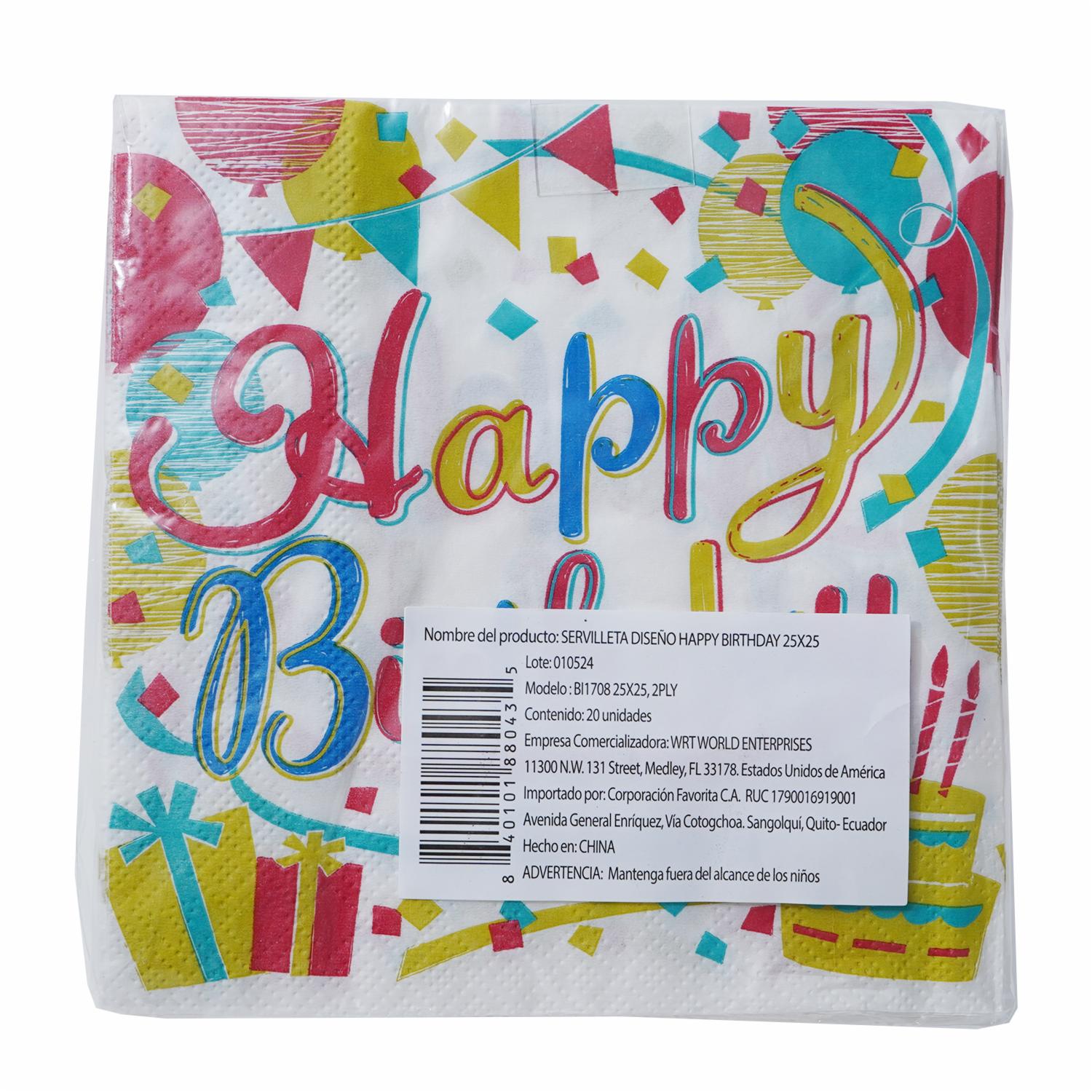 Servilleta Happy Birthday Colores 25X25 DFHO 20 U