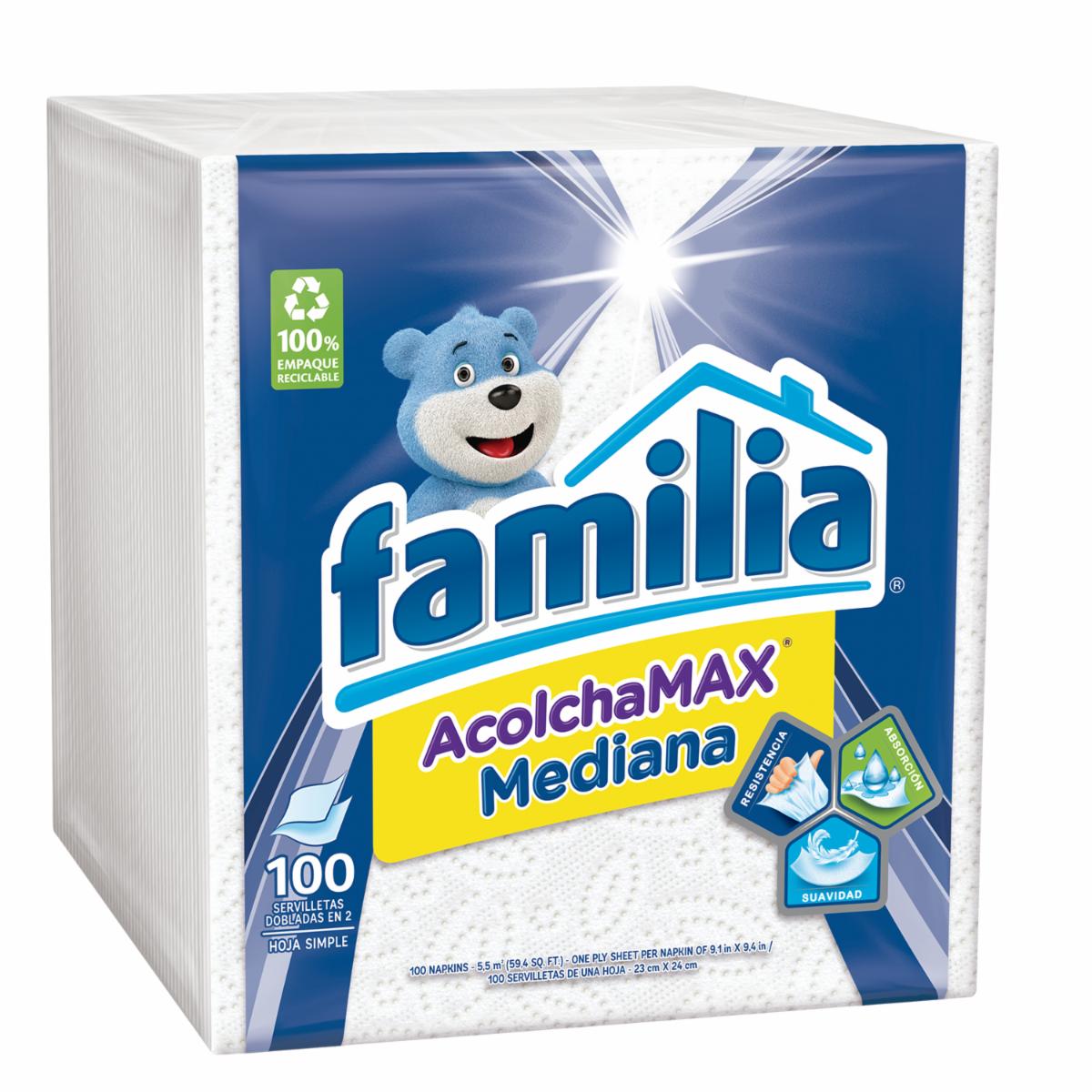 - Las Servilletas Familia Acolchamax Mediana, Te Ofrecen Mayor Rendimiento Y Como Son Tan Absorbentes Y Resistentes, Solo Una Es Suficiente. Son Doble Hoja Dobladas En Dos. Si Buscas Un Mayor Tamaño, Prueba Las Servilletas Familia Acolchamax Normal