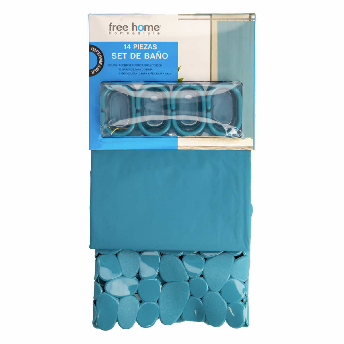 Set De Baño Cortina+Antideslizante Aqua Claro FREE HOME 2 Piezas