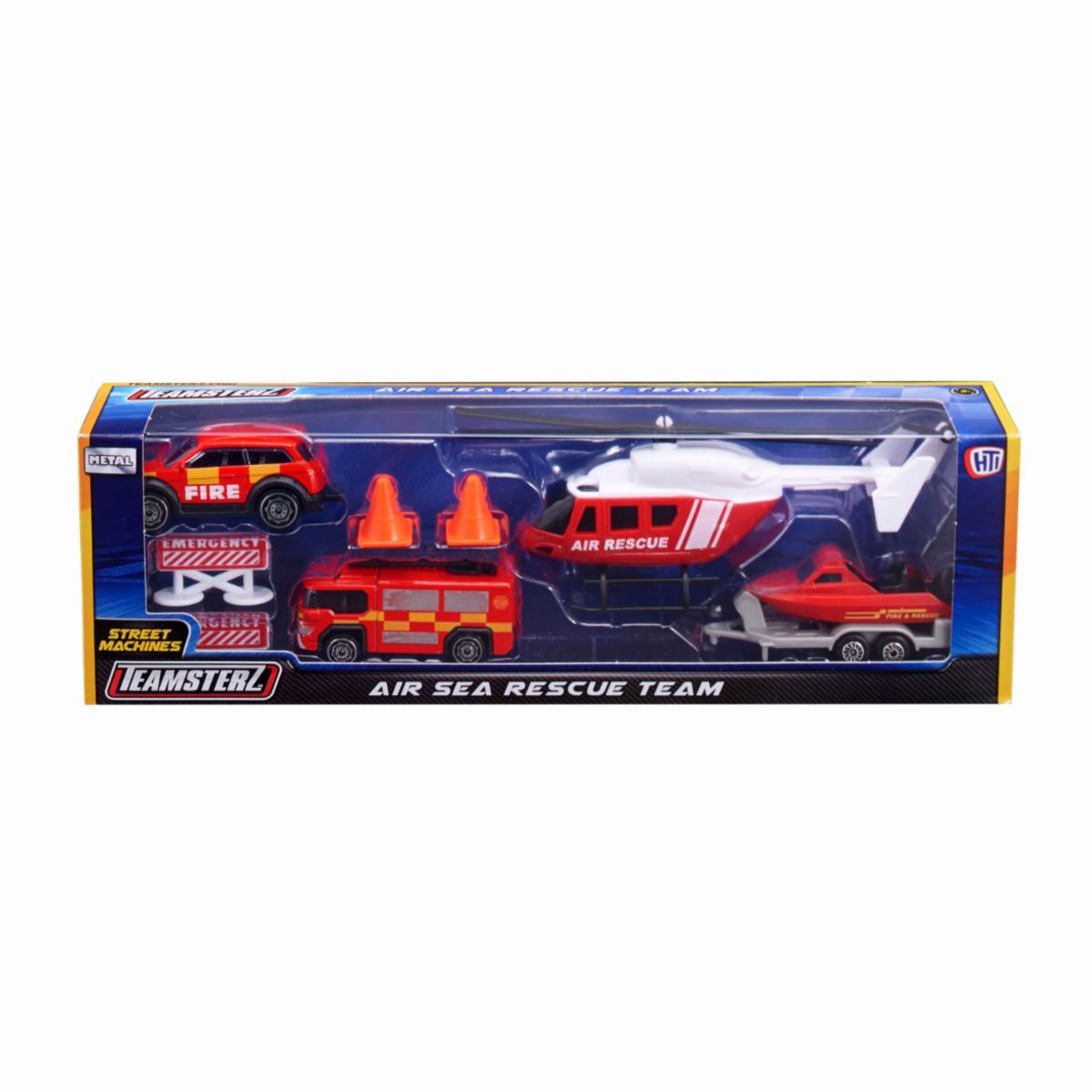 Prepárate para tus propias misiones de rescate en el mar con el juego Teamsterz Air Sea Rescue Team. El juego incluye un helicóptero fundido a presión muy detallado con palas de hélice que giran manualmente, un vehículo de emergencia, un vehículo 4x4 con barra de remolque, una boa de plástico