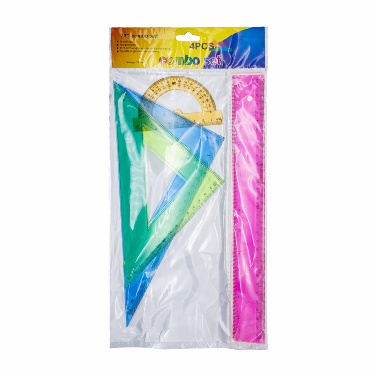- El Set Geométrico 4 Pz 30 Cm es un conjunto de herramientas de dibujo que incluye una regla de 30 cm, un transportador, una escuadra y un compás. Estas herramientas son utilizadas en la geometría, matemáticas y diseño para realizar mediciones precisas, trazar líneas rectas, ángulos y círculos. Son útiles para estudiantes de arquitectura, ingeniería y diseño gráfico