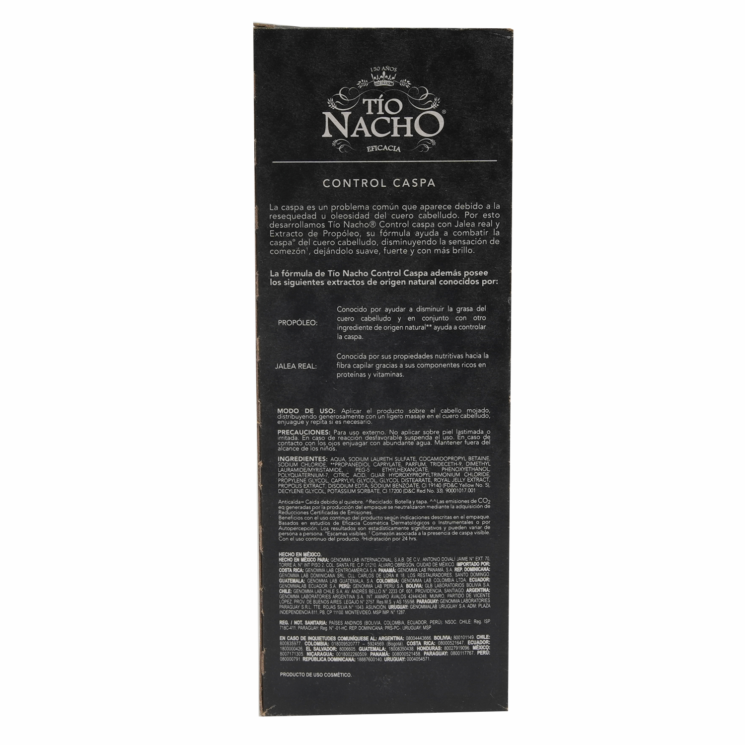- El shampoo anticaída Tío Nacho combina jalea real y propóleo para fortalecer tu cabello desde la raíz. Controla eficazmente la caspa sin resecar, brindando hidratación duradera y un cuero cabelludo saludable. Una fórmula natural para lucir un cabello más fuerte, limpio y lleno de vida