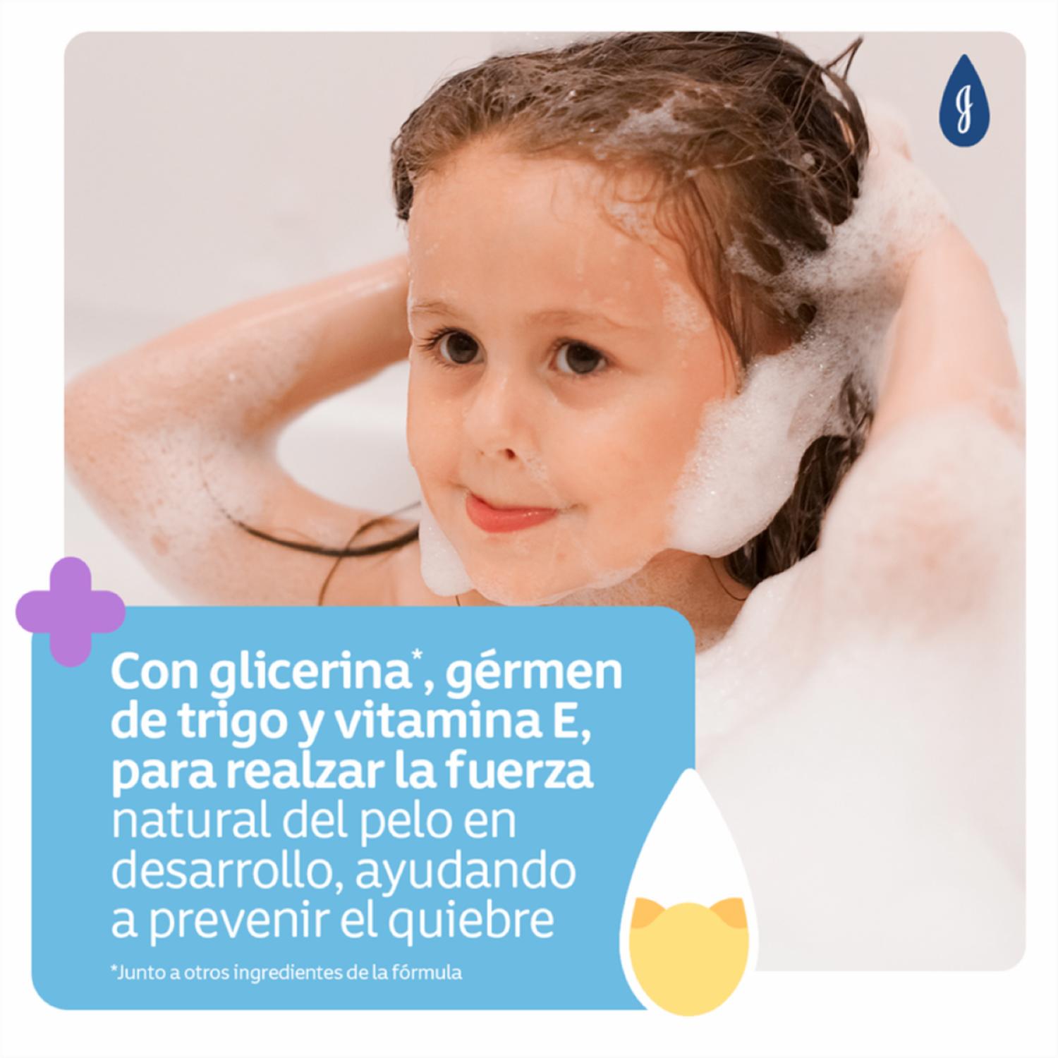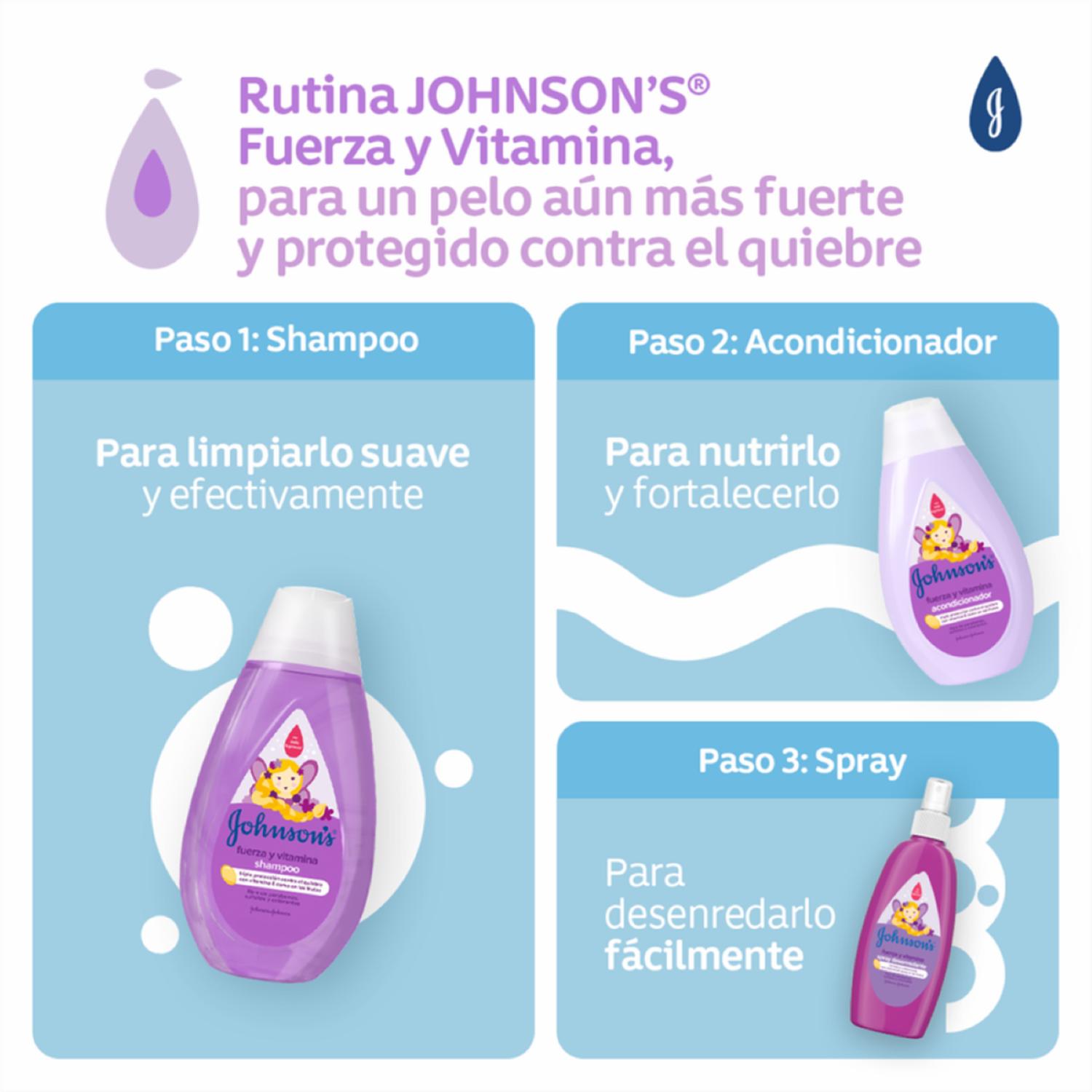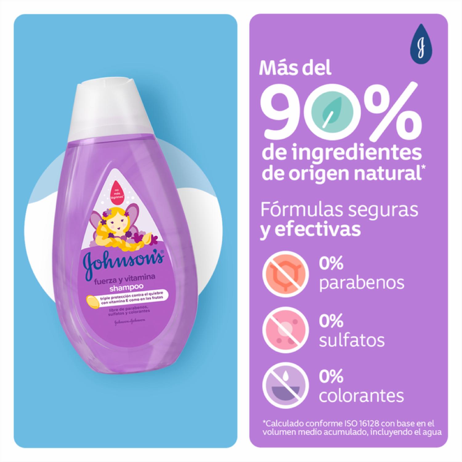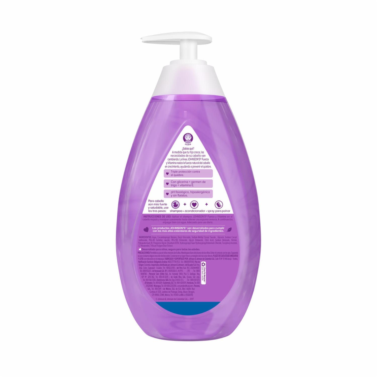 - Shampoo JOHNSON'S Fuerza Vitamina realza la fuerza natural propia del pelo en desarrollo, con triple protección contra el quiebre