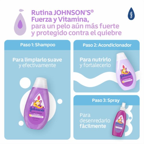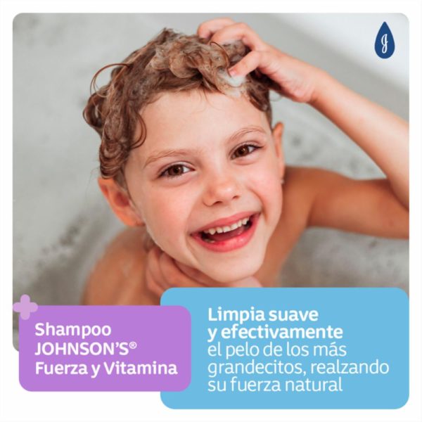 Shampoo JOHNSON'S Fuerza Vitamina realza la fuerza natural propia del pelo en desarrollo, con triple protección contra el quiebre