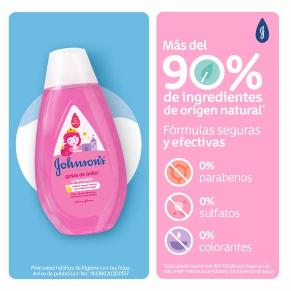 Shampoo JOHNSON'S® Gotas de Brillo realza el brillo natural del pelo, dejándolo suave y con un toque aterciopelado, ya que cuenta con aceite de argán y proteínas de seda en su formulación