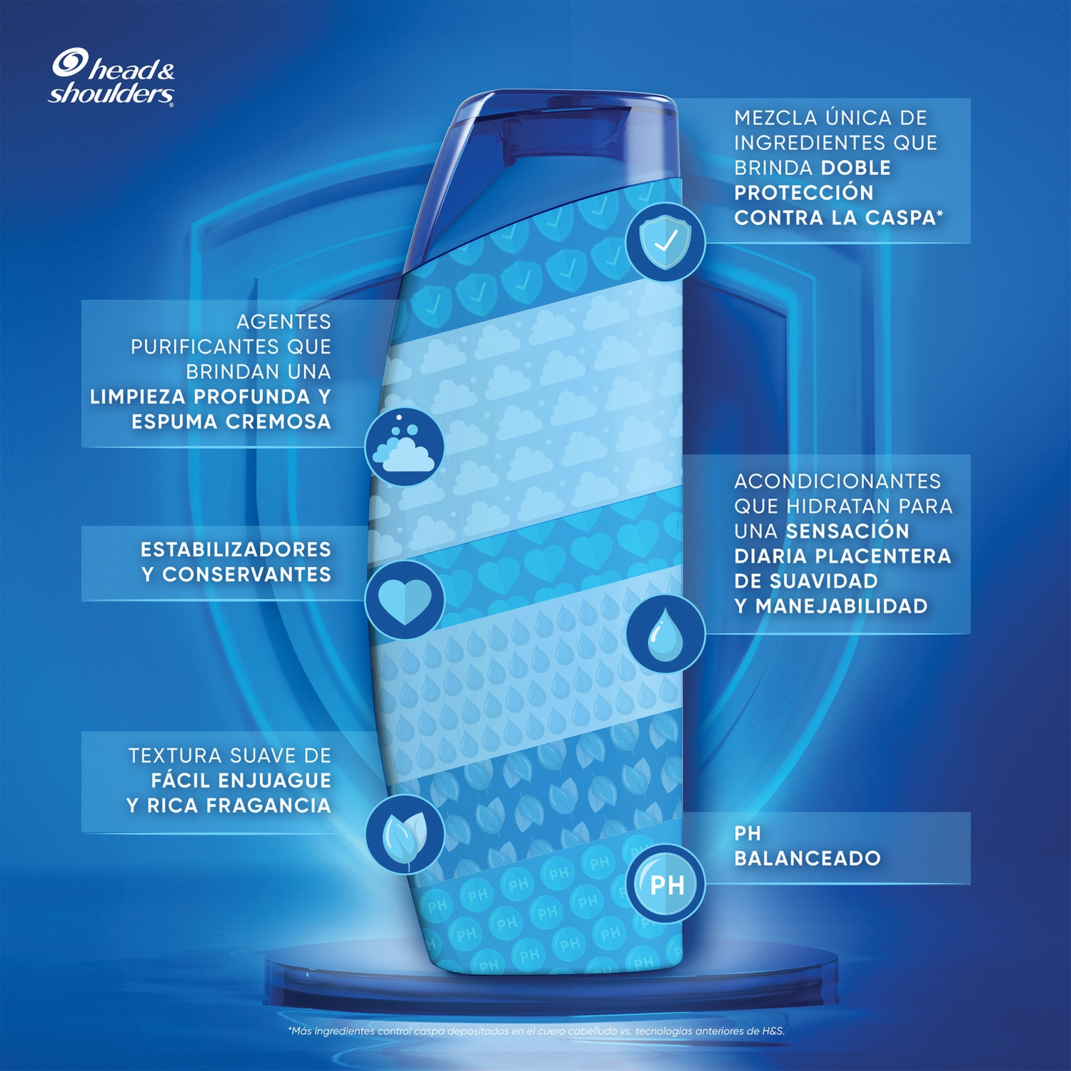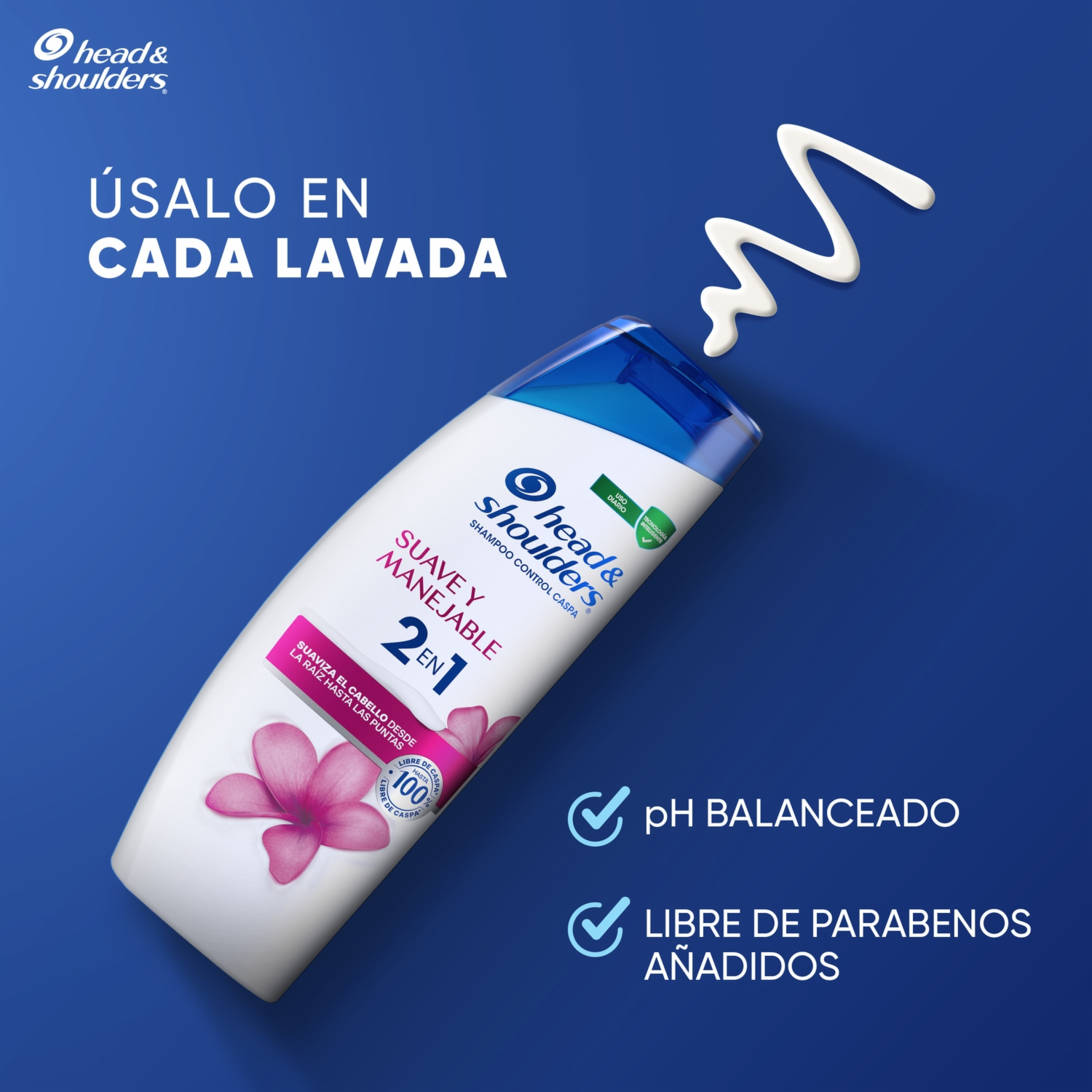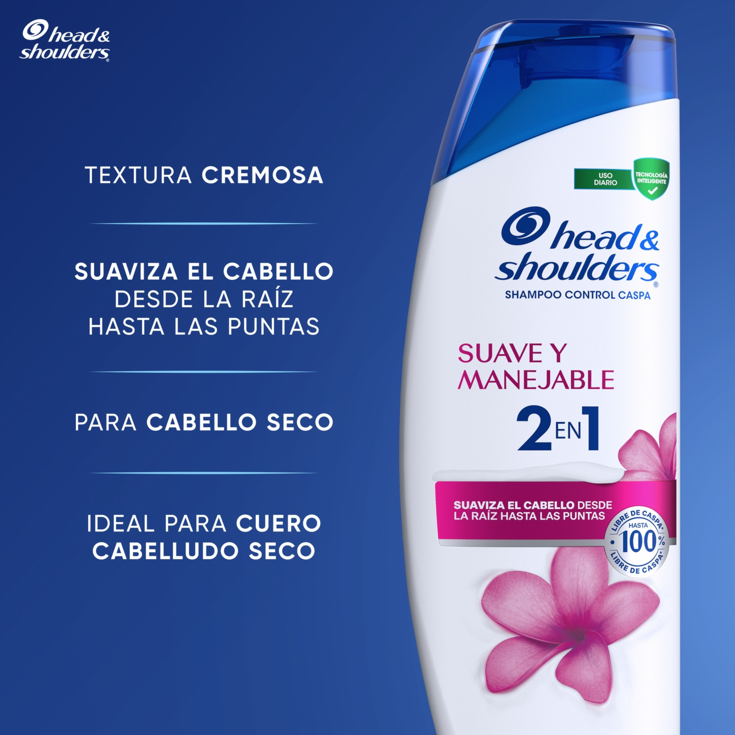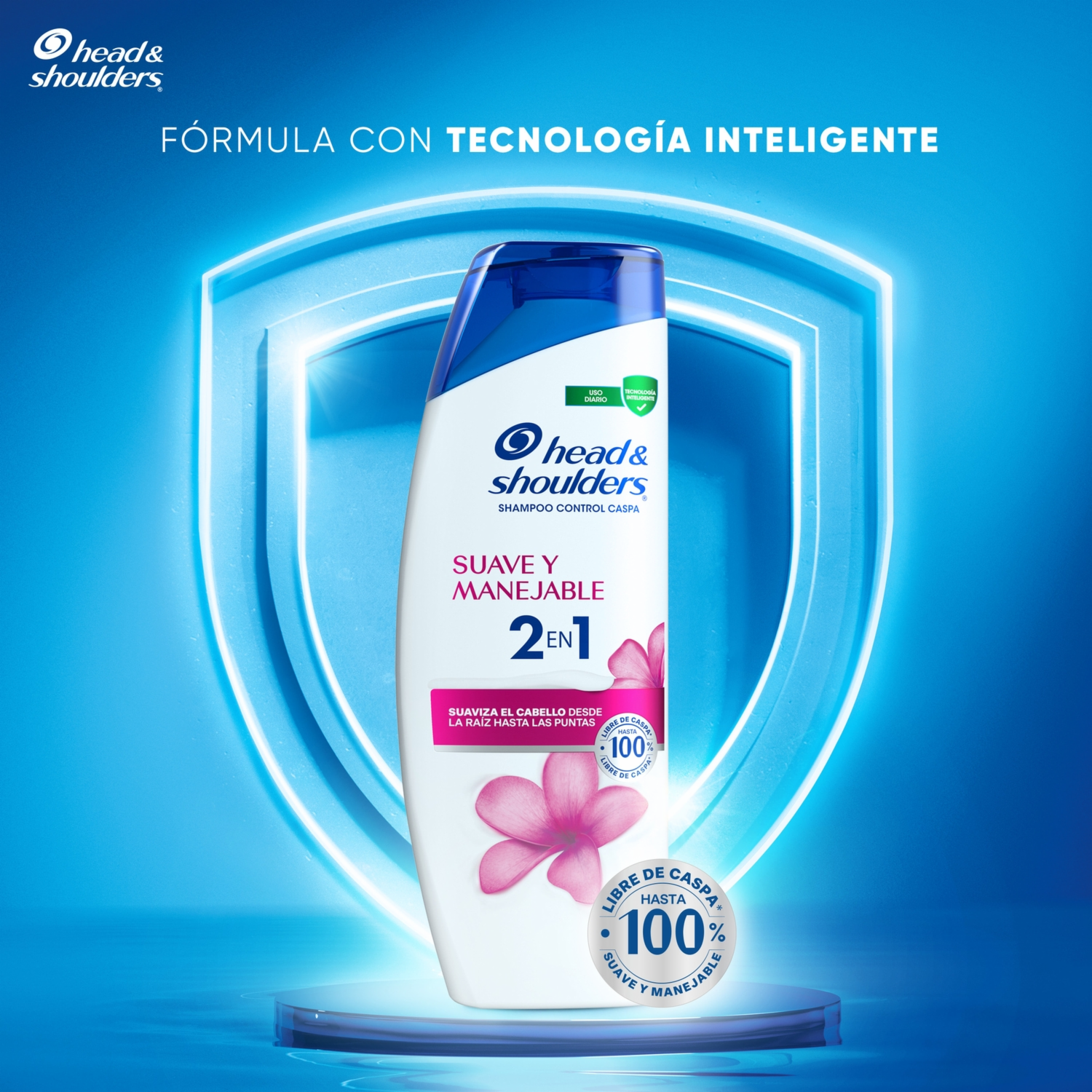 - El SHAMPOO SUAVE Y MANEJABLE 2 EN 1 es un shampoo para caspa práctico y con un exquisito aroma floral. La nueva fórmula de Head and Shoulders con tecnología inteligente que actúa donde es necesario; protege contra la caspa*, brinda un cuidado especial al cuero cabelludo, manteniendo un cabello suave y hermoso de raíz a puntas. Úsalo diariamente para tener un cabello más suave y hasta 100% libre de caspa*
