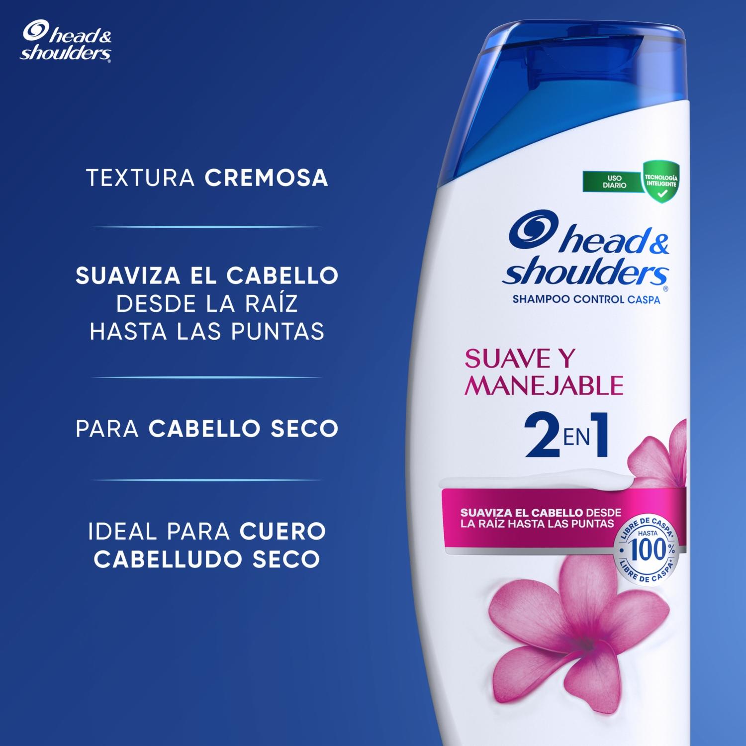 • El SHAMPOO SUAVE Y MANEJABLE 2 EN 1 es un shampoo para caspa práctico y con un exquisito aroma floral. La nueva fórmula de Head and Shoulders con tecnología inteligente que actúa donde es necesario; protege contra la caspa*, brinda un cuidado especial al cuero cabelludo, manteniendo un cabello suave y hermoso de raíz a puntas. Úsalo diariamente para tener un cabello más suave y hasta 100% libre de caspa*