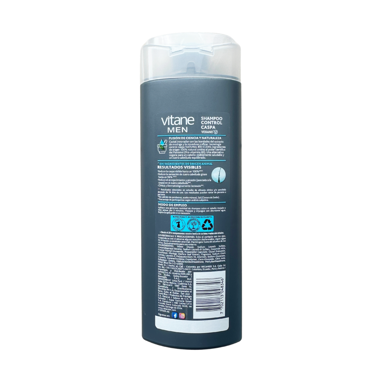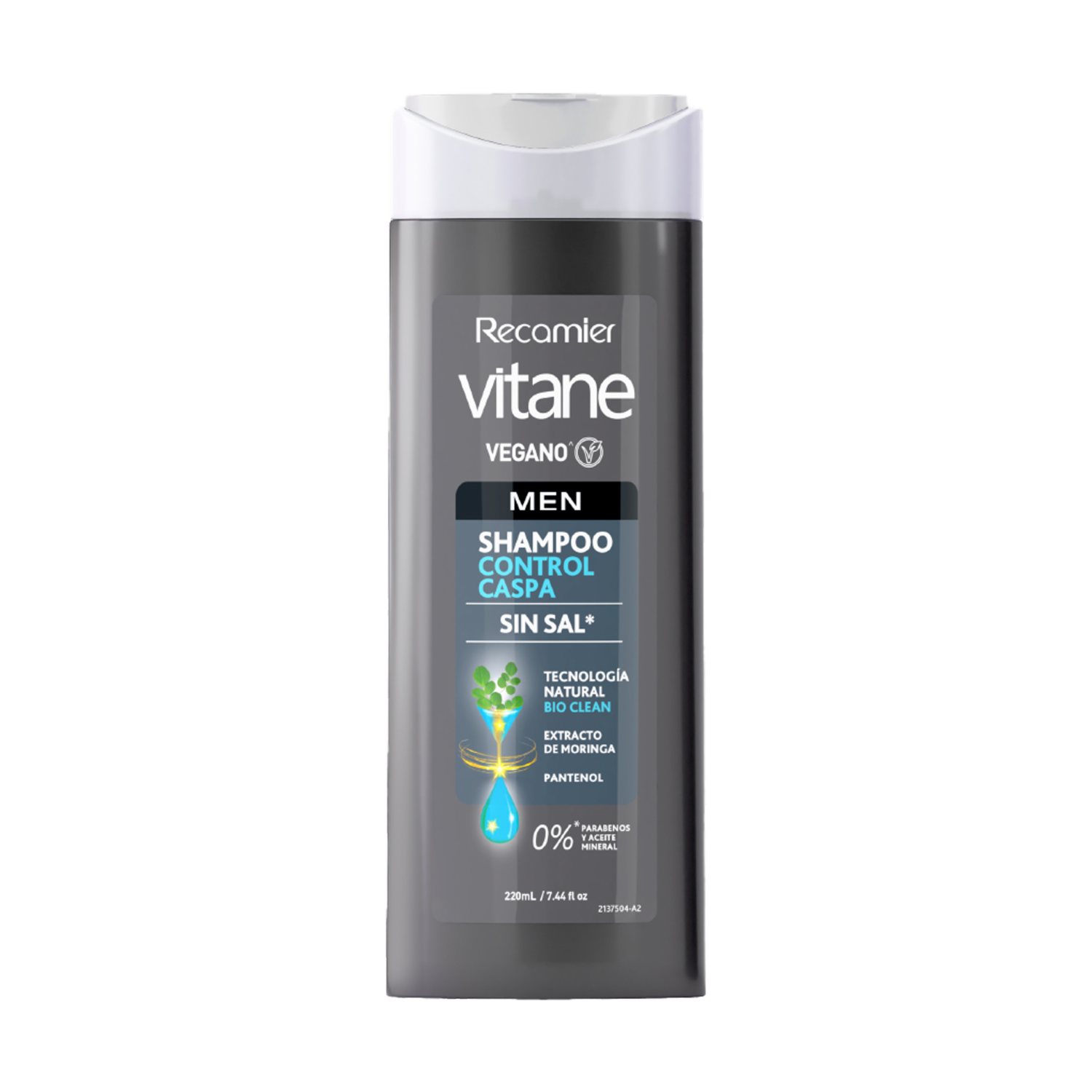 - Elimina impurezas y fortalece el cabello. Reduce la caspa visible gracias a su fórmula innovadora con extracto de Moringa y BioClean, activo 100% de origen natural y reduce la sensación de cuero cabelludo graso. Modo de empleo: Humedece el cabello, aplica Vitane Shampoo Hombre Anticaspa haciendo un suave masaje y enjuaga. Contenido: 220 ml