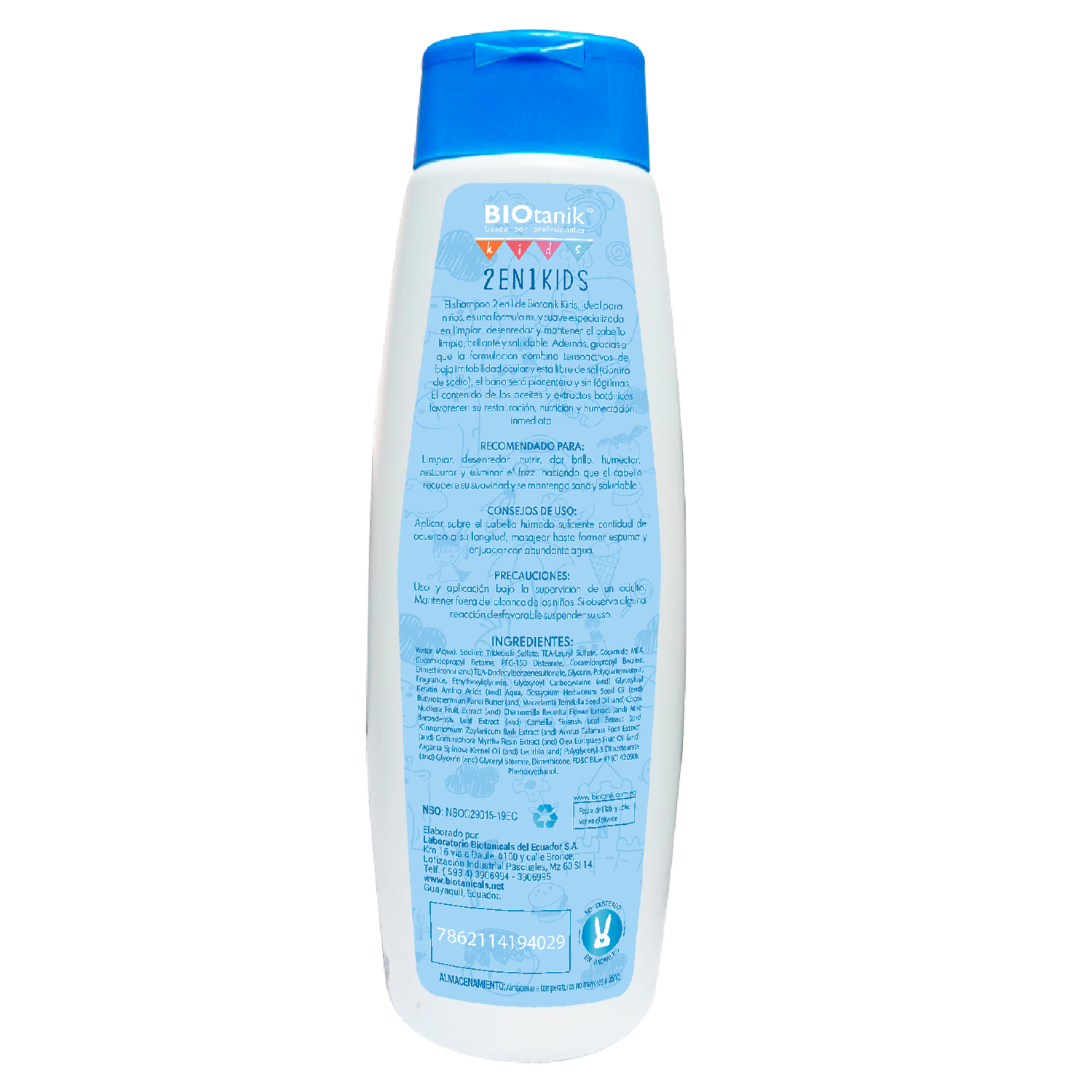 El shampoo 2 en 1 de Biotanik Kids, ideal para niños, es una fórmula muy suave especializada en limpiar, desenredar y mantener el cabello limpio, brillante y saludable. Además, gracias a que la formulación combina tensoactivos de baja irritabilidad ocular y está libre de sal (cloruro de sodio), el baño será placentero y sin lágrimas. El contenido de los aceites y extractos botánicos favorecen su restauración, nutrición y humectación inmediata