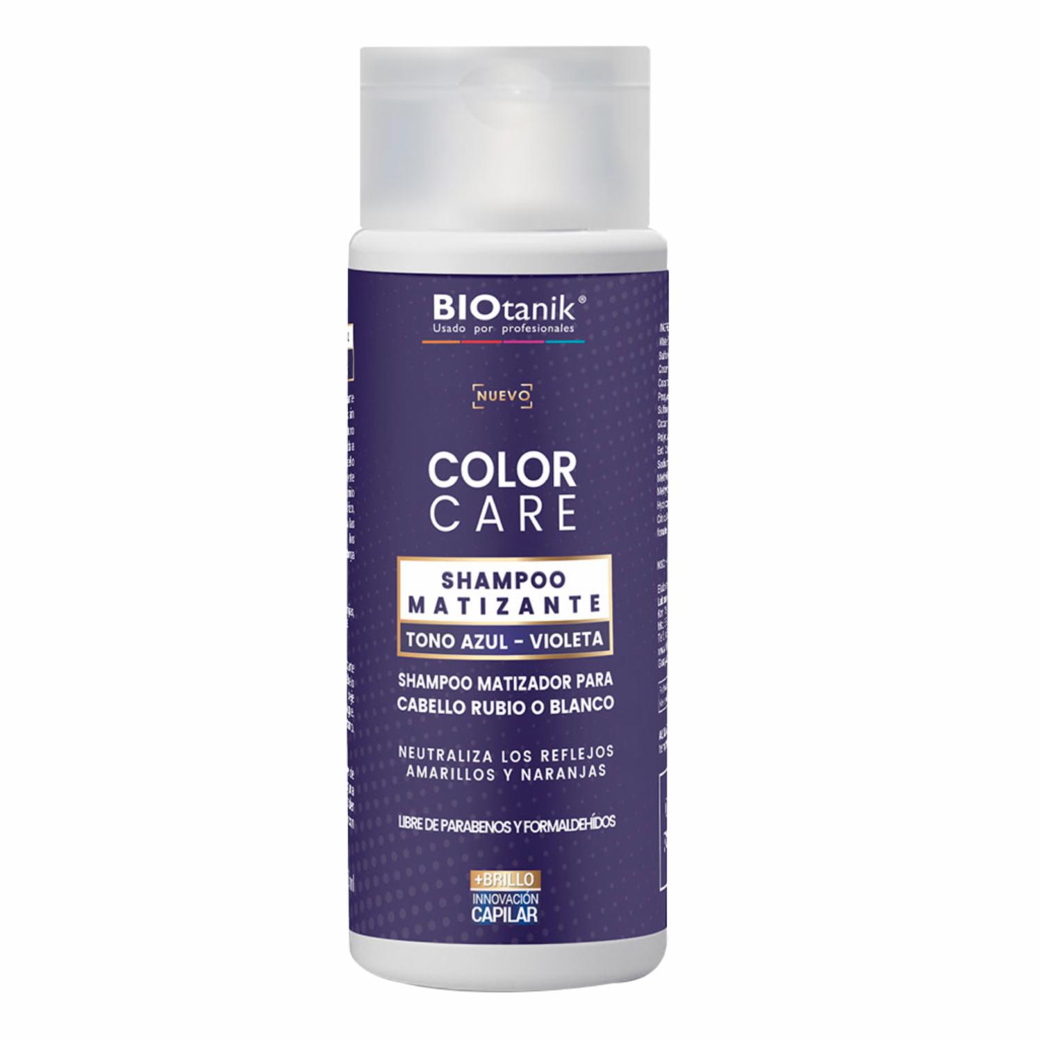 El nuevo shampoo matizante COLOR CARE de BIOtanik sin parabenos, formulado en tono azul - violeta, matiza y ayuda a reavivar el tono del cabello decolorado o naturalmente rubio, cuando este ha adquirido cierto efecto naranja, cobrizo, verdoso u opaco. Matiza las canas, neutralizando los tonos amarillentos, otorga humectación y brillo