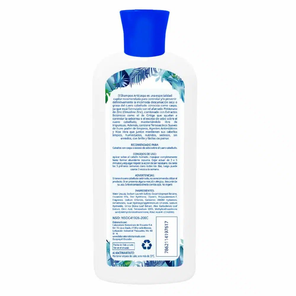 • El Shampoo Anticaspa es una especialidad capilar recomendada para controlar y/o prevenir definitivamente la incómoda descamación seca o grasa del cuero cabelludo conocida como caspa, ya que está formulado con el afamado Piritionato de Zinc (Omadine Zinc), combinado con Extractos Botánicos como el de Ortiga que ayudan a controlar la seborrea o el exceso de sebo sobre el cuero cabelludo, manteniéndolo libre de impurezas