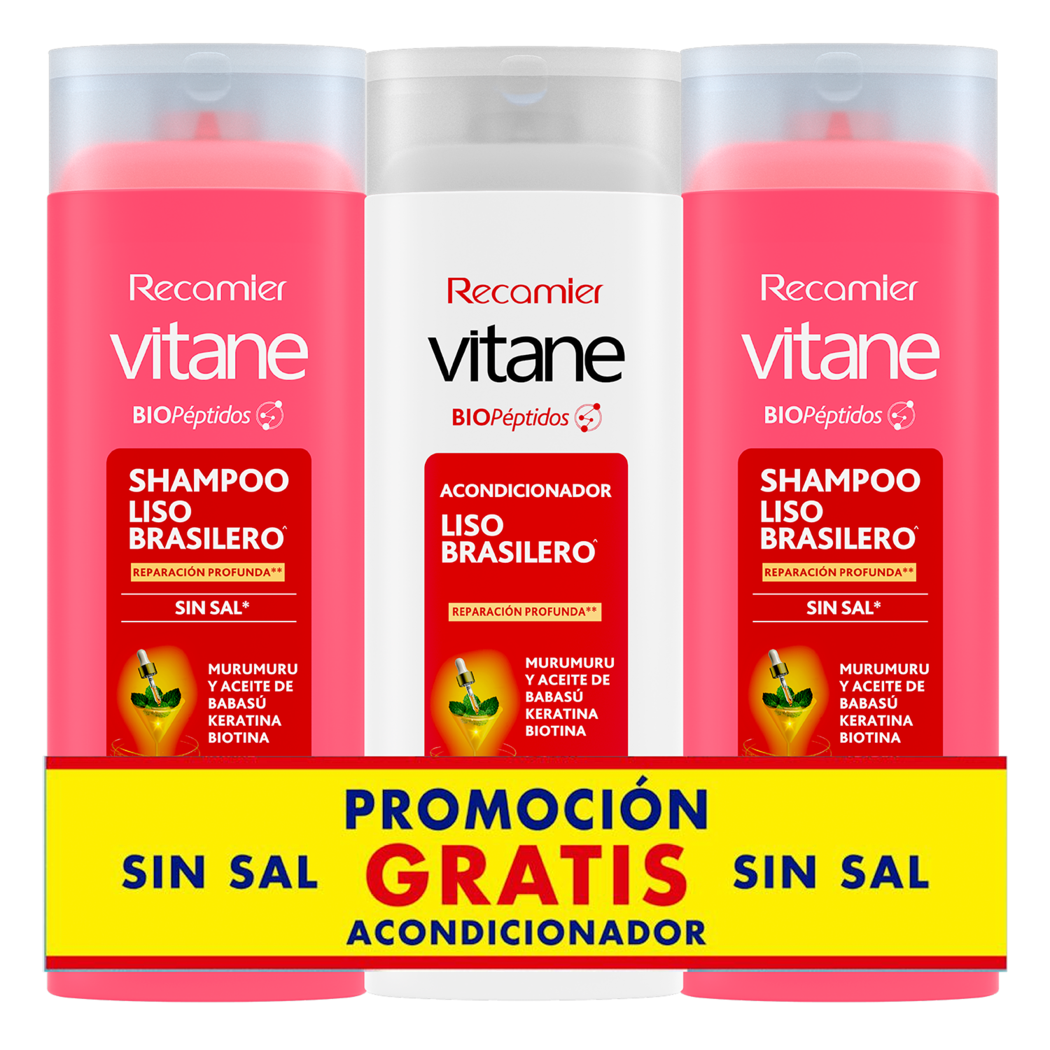 Vitane Shampoo Liso Brasilero + Acondicionador con tecnología de péptidos, fórmula sin sal que limpia, nutre, hidrata y suaviza tu cabello, dejándolo sedoso y brillante. Modo de empleo Shampoo: Humedece el cabello, aplica una generosa cantidad de shampoo, realiza un suave masaje y enjuaga con abundante agua. Acondicionador: Después de lavar el cabello, aplica el acondicionador sobre el cabello húmedo, de medios a puntas, deja actuar de 1 a 2 min y enjuaga con abundante agua