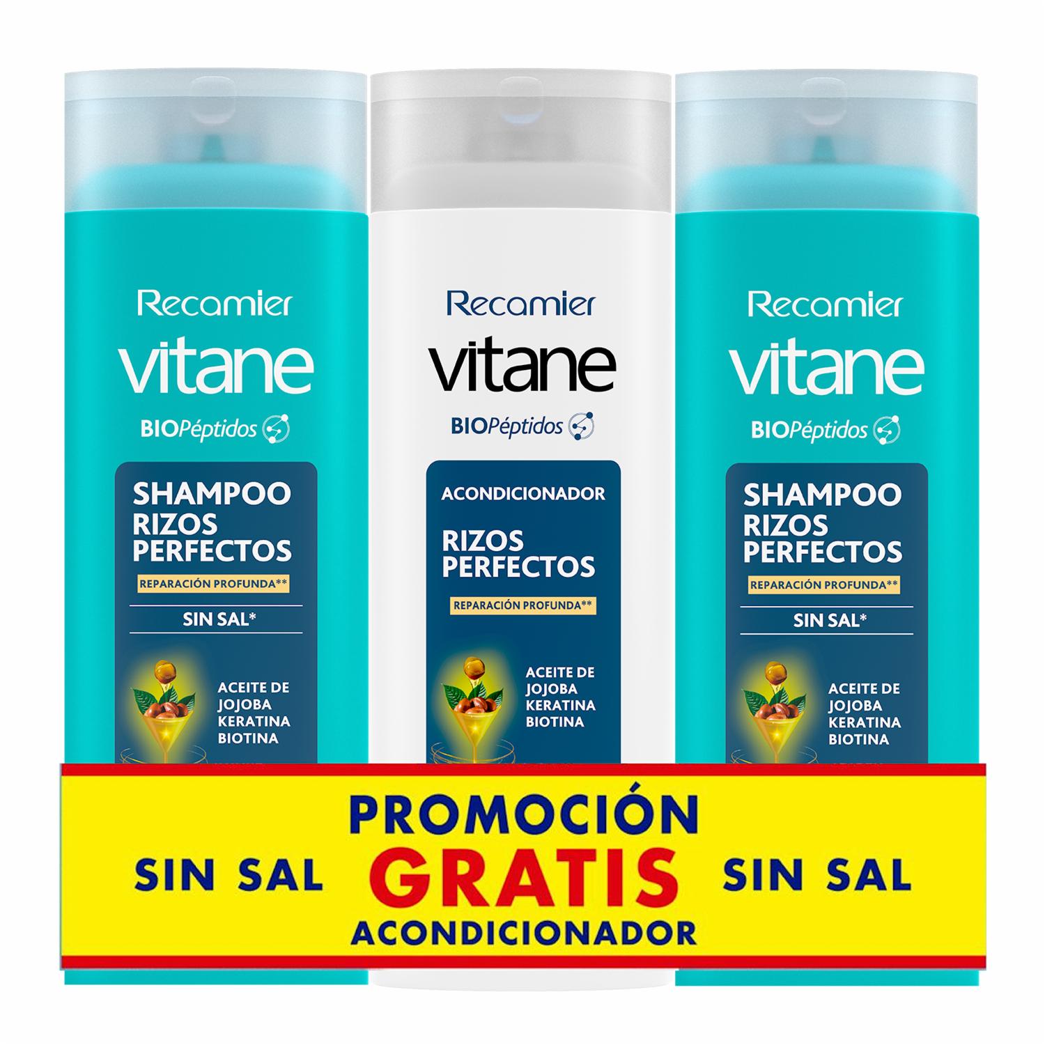 - Vitane Shampoo Rizos perfectos + Acondicionador con tecnología de péptidos y sin sal, repara los daños del cabello combinando lo mejor de la ciencia y la naturaleza. Modo de empleo Shampoo: Aplica una generosa cantidad de shampoo sobre el cabello mojado, realiza un suave masaje y enjuaga con abundante agua.Acondicionador: Después de lavar el cabello, aplica el acondicionador sobre el cabello húmedo, de medios a puntas, deja actuar de 1 a 2 min y enjuaga con abundante agua