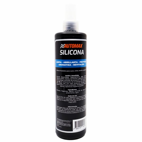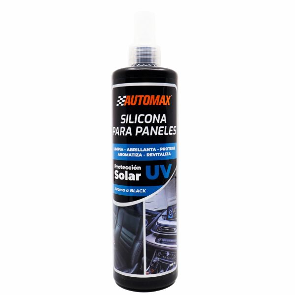 SILICONA UV AUTOMAX: para tableros Silicona para limpieza de tableros con protector UV. Formula desarrollada especialmente para limpiar tableros, vinilos, repisas, escritorios y gabinetes. Cuenta con tecnología avanzada de protección solar contra los rayos UV. Su composición de emulsiones de silicona de alta calidad crea una capa protectora duradera que repele el polvo y otras suciedades