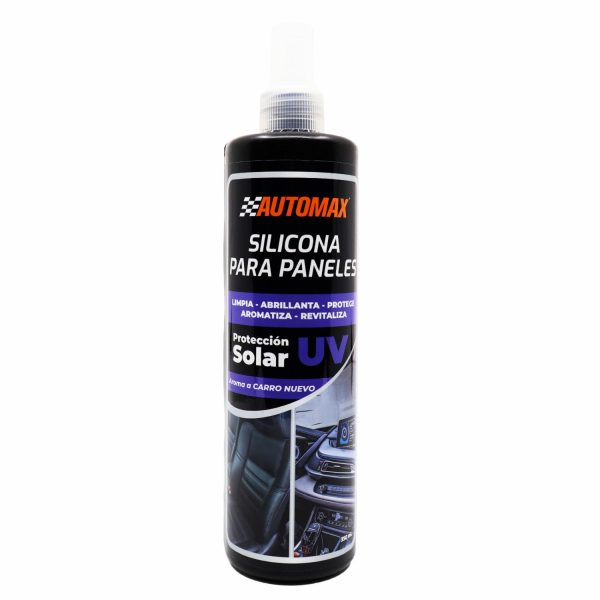 SILICONA UV AUTOMAX: para tableros Silicona para limpieza de tableros con protector UV. Formula desarrollada especialmente para limpiar tableros, vinilos, repisas, escritorios y gabinetes. Cuenta con tecnología avanzada de protección solar contra los rayos UV. Su composición de emulsiones de silicona de alta calidad crea una capa protectora duradera que repele el polvo y otras suciedades