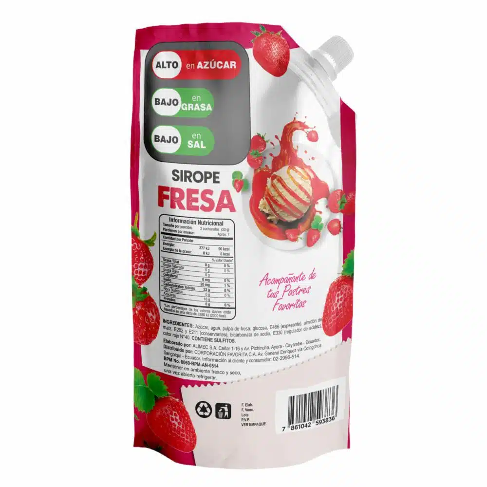 Jarabe dulce, con sabor a fresa, ideal para acompañar fruta picada, postres y helados.  Ideal para repostería y decoración