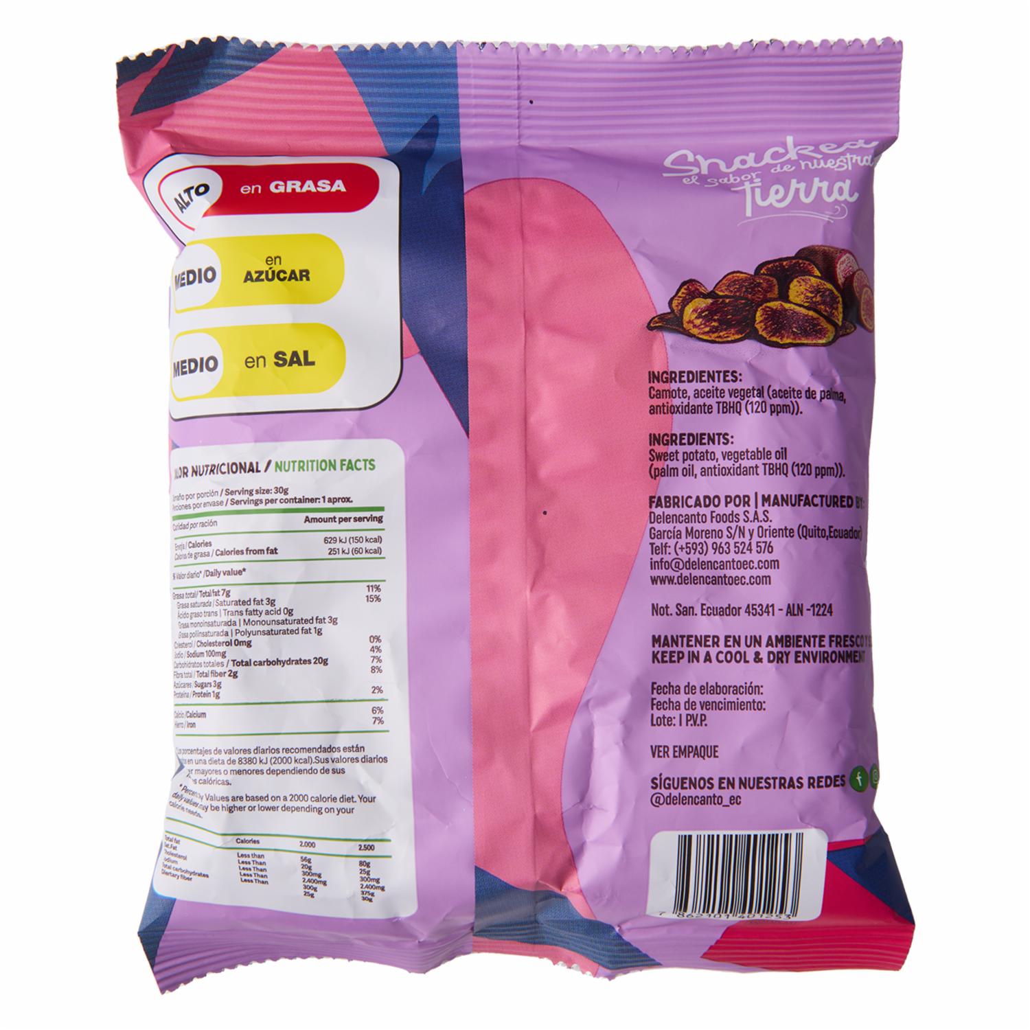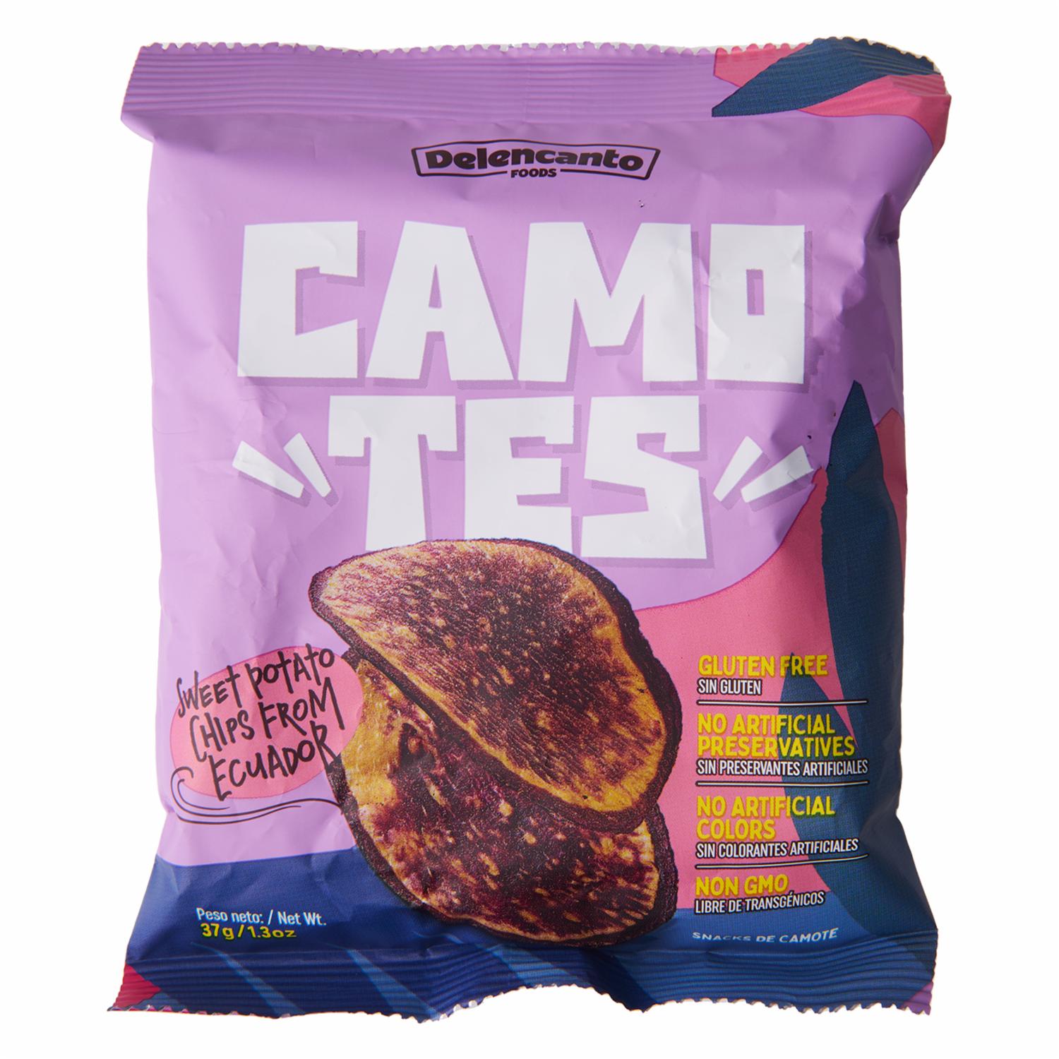 - Snack ideal para cualquier momento del día - Cada empaque contiene 37 g de camote - Son libres de gluten - Son aptos para veganos - No contienen conservantes ni colorantes artificiales - Son crocantes y se pueden acompañar con un dip - Contienen solo 2 ingredientes - Perfectas para lonchera
