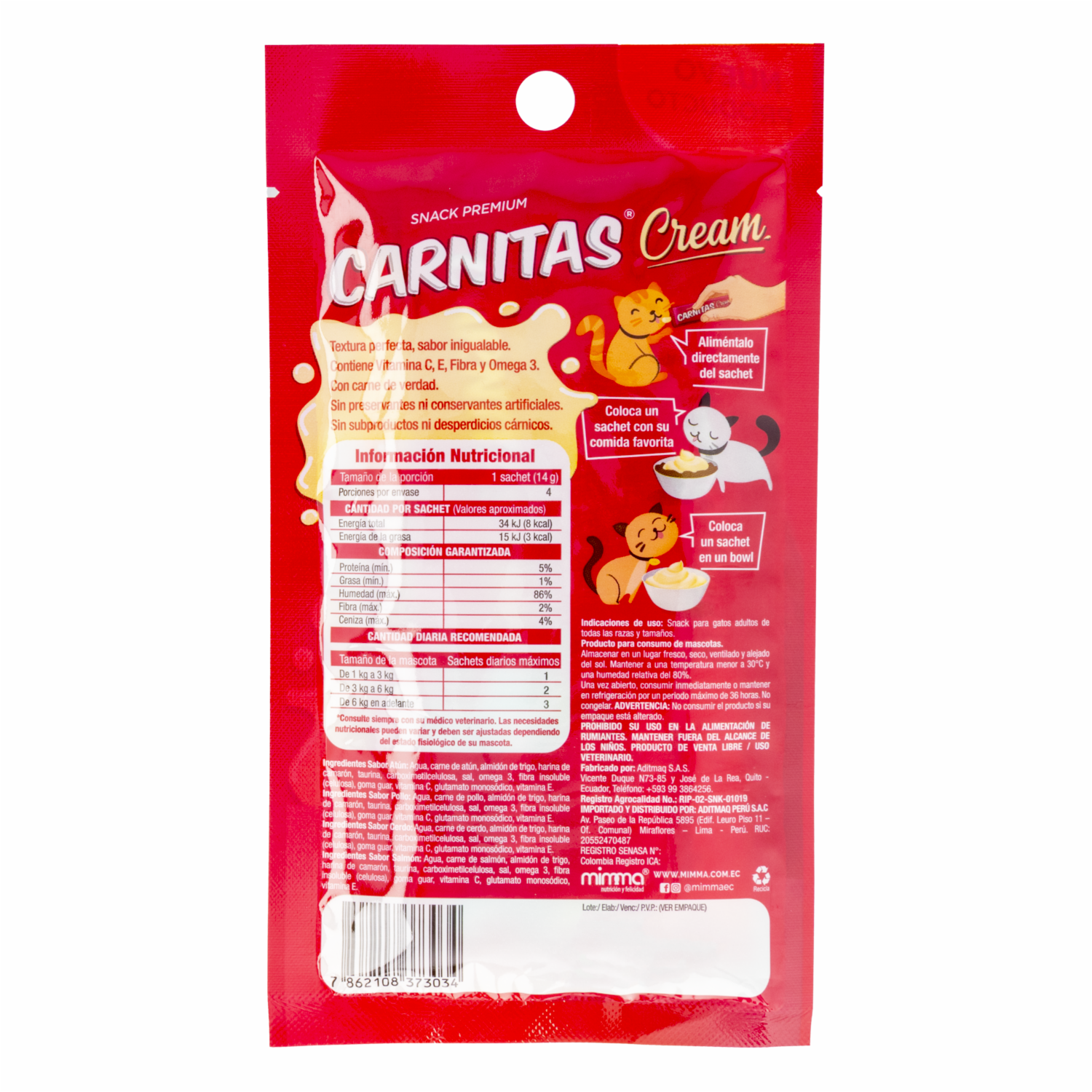 - ¡Mima a tu gato con este delicioso snack! El Cream Mix de Sabores Carnitas está elaborado con ingredientes de alta calidad que le brindarán un sabor irresistible. Su textura suave y cremosa lo convierte en una experiencia única para tu felino, ideal para premiarlo o consentirlo entre comidas. ¡Perfecto para que tu gato disfrute en cualquier momento del día!
