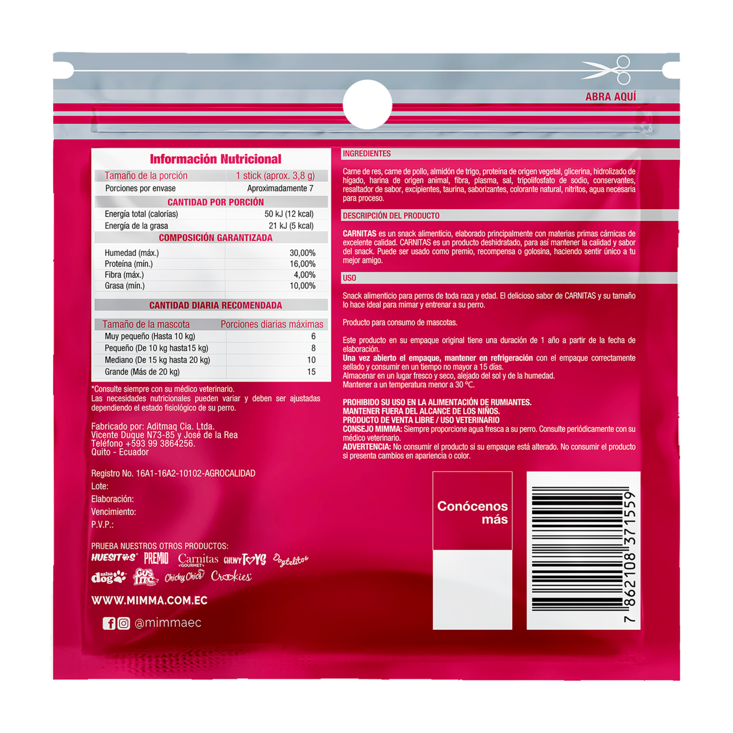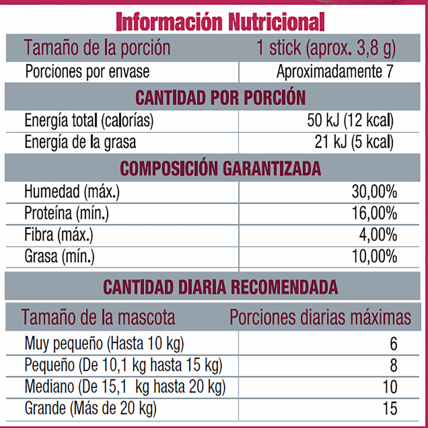 - Delicioso stick de carne que proporciona proteína de alta digestibilidad. Alto contenído de proteína, cada stick contiene un mínimo de 30% de proteína