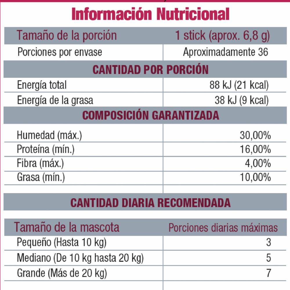 • Delicioso stick de carne que proporciona proteína de alta digestibilidad. Alto contenído de proteína, cada stick contiene un mínimo de 30% de proteína