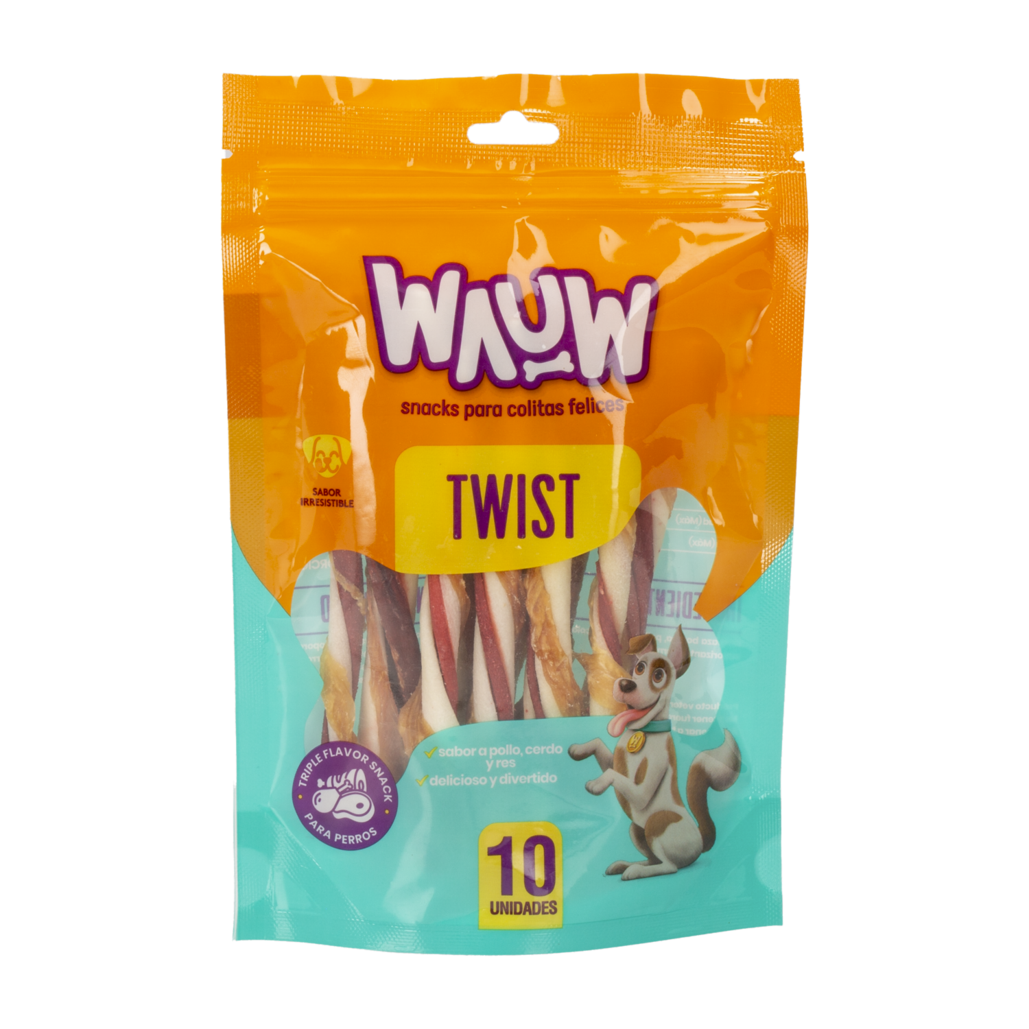 - Los Twists WAUW son un delicioso y nutritivo snack para perros que ofrecen una combinación perfecta de sabor y textura. Estos twists están diseñados para satisfacer la necesidad natural de masticar de tu mascota, manteniéndola entretenida y feliz
