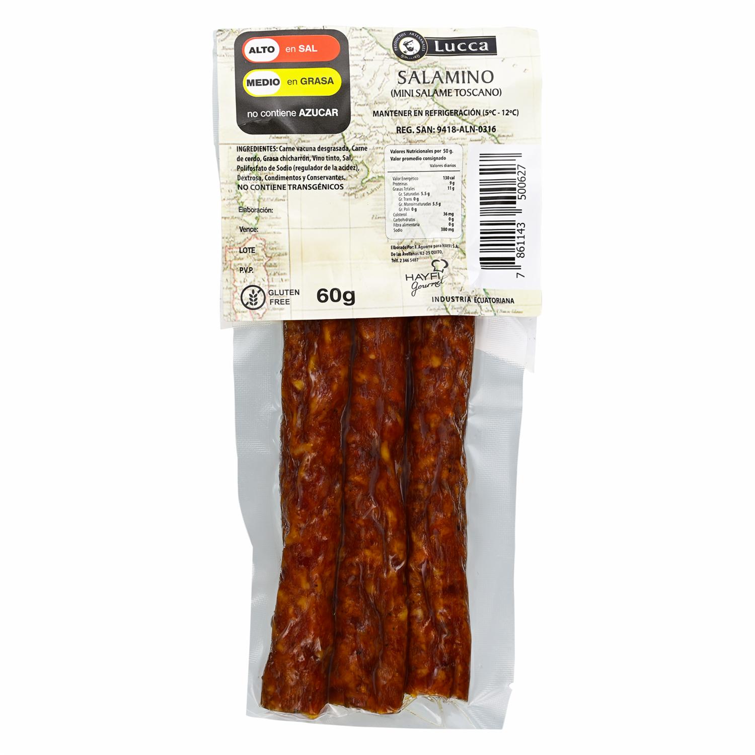 Snack Salamino Toscano LUCCA 60g – LUCCA. Disponible en nuestros locales. Precio y stock pueden variar según la tienda.