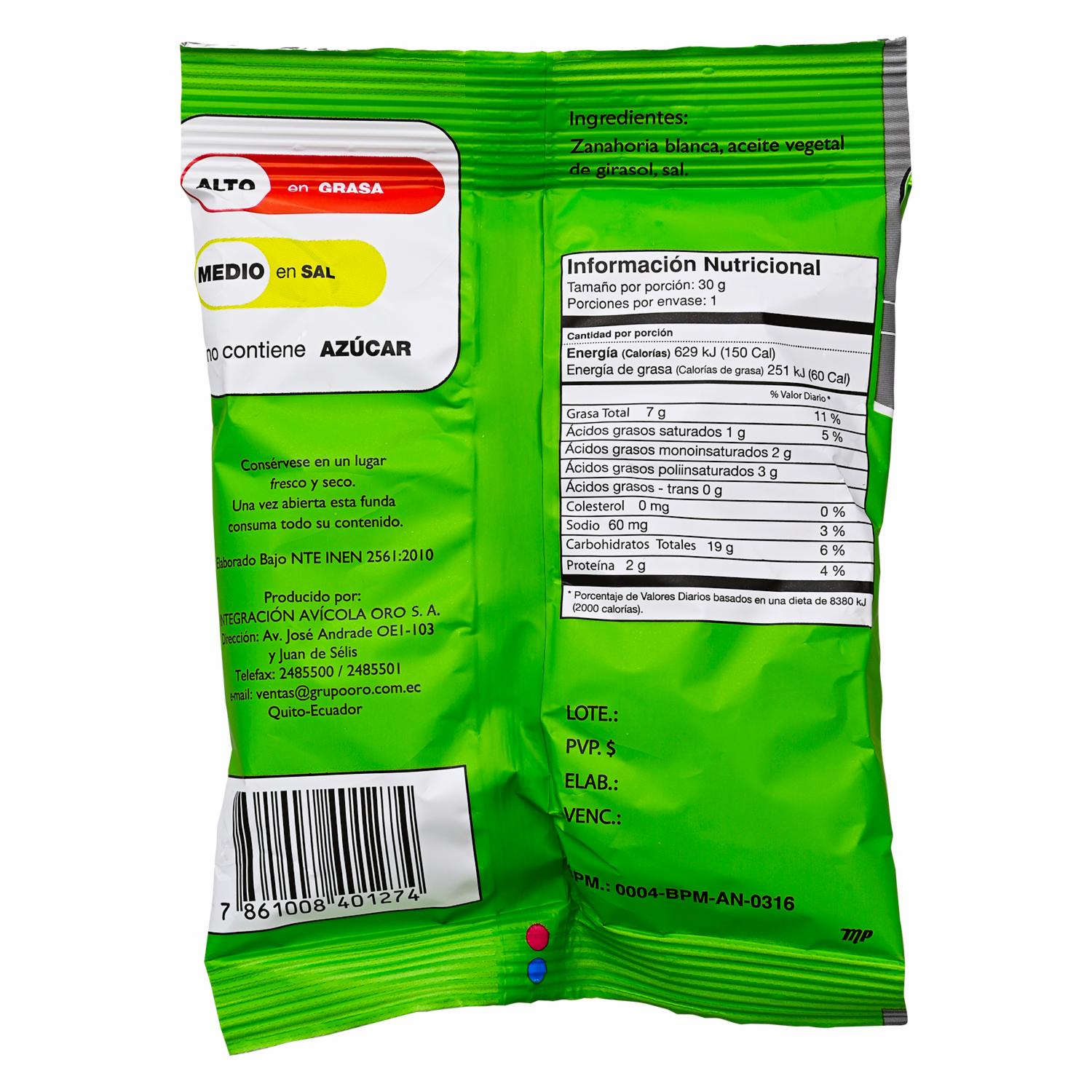 - Snack elaborado a base de zanahoria blanca, un deleite distinto a los snacks tradicionales