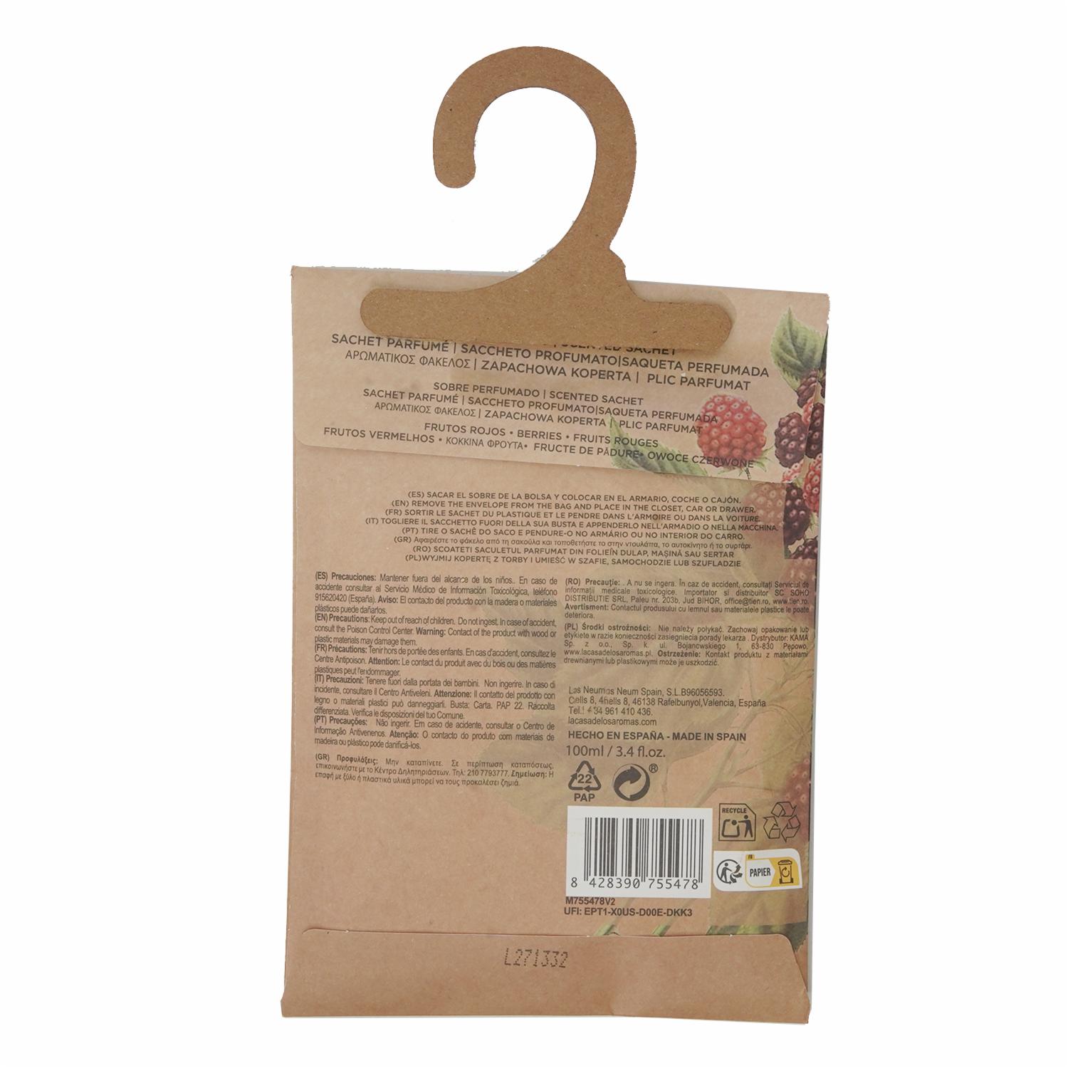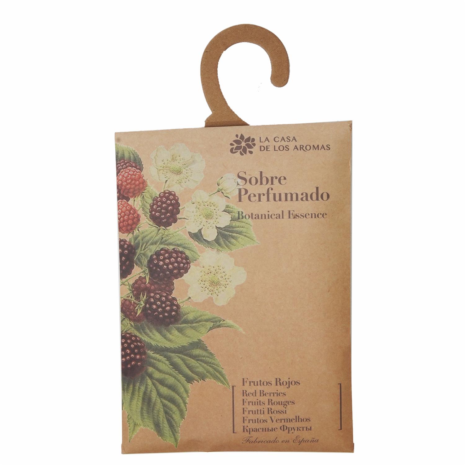 Los sobres perfumados son perfectos para colgar en cualquier sitio, una opción ideal para perfumar tu armario, cajones o espacios cerrados que le aportarán un aroma único. El aroma de frutos rojos es muy dulce y afrutado, una mezcla de fresas, moras y frambuesas