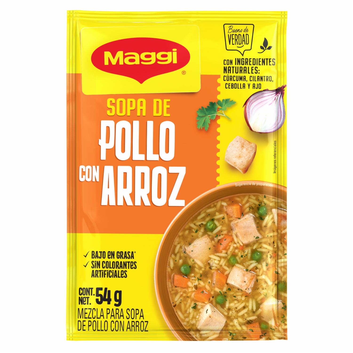 - Maggi Sopa de Pollo con Arroz de fácil preparación, hecha con ingredientes naturales. Sin colorantes artificiales,ni grasas trans