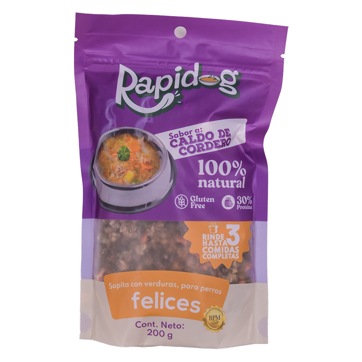 - Consiente a tu perro con la sopa de verduras RAPIDOG sabor a cordero, una combinación nutritiva y deliciosa. Perfecta para aportar vitaminas y minerales esenciales, ideal para su bienestar diario. Presentación de 200 g que ofrece un toque casero y saludable en cada comida