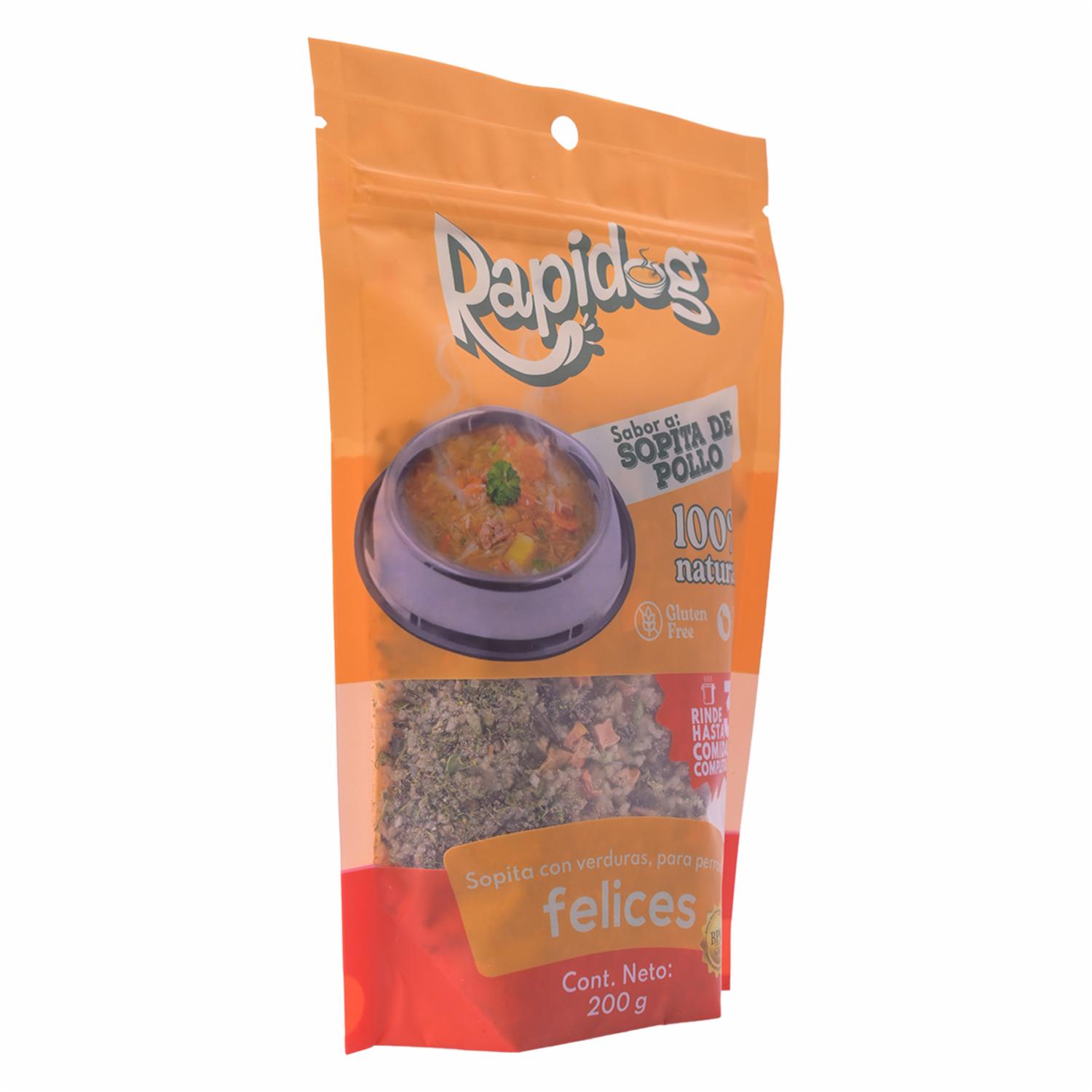 - Calienta el corazón de tu perro con la sopa de verduras RAPIDOG sabor a pollo. Una receta nutritiva y ligera, perfecta para complementar su alimentación diaria. En presentación de 200 g, es ideal para cuidar su salud y brindarle un sabor casero que le encantará